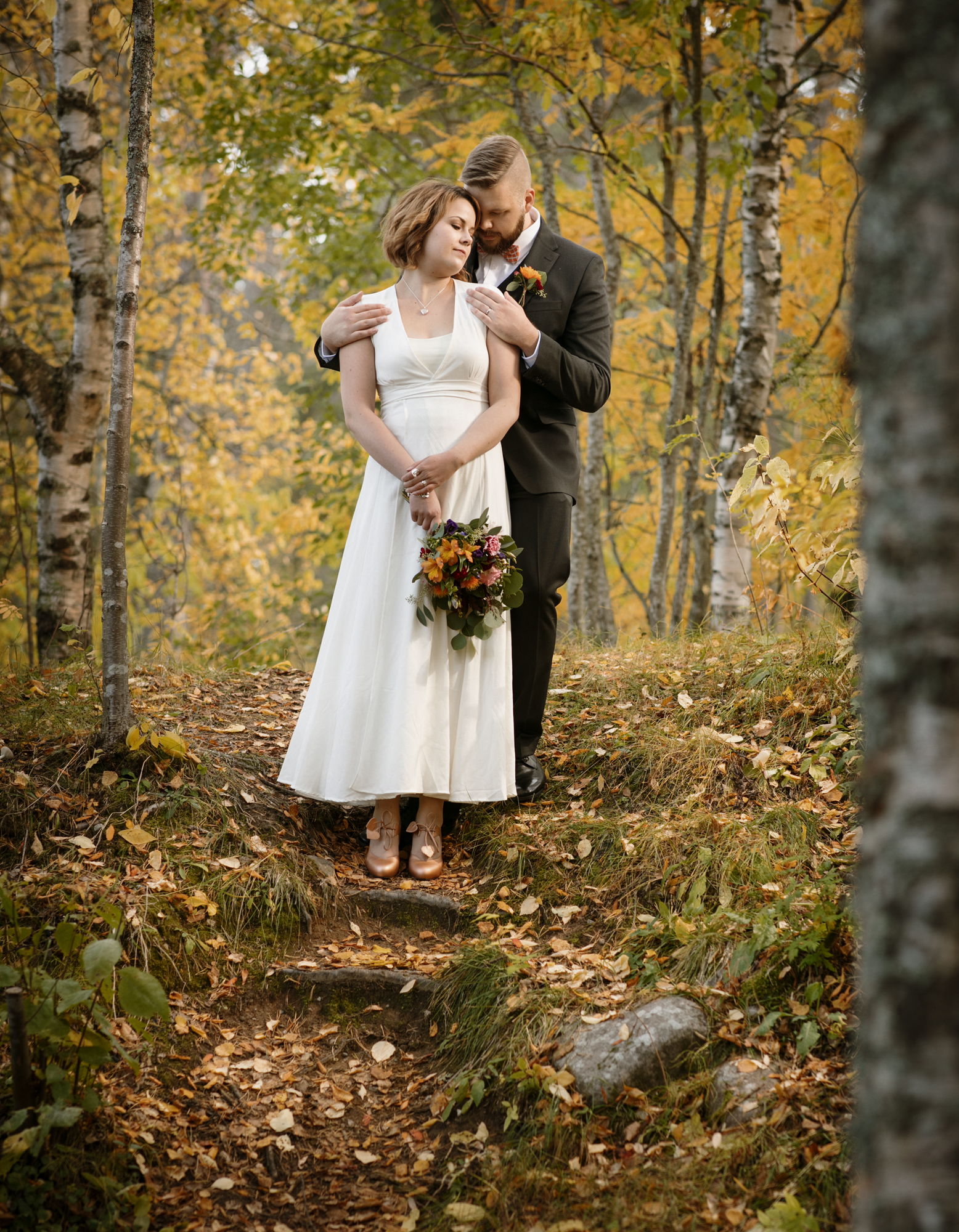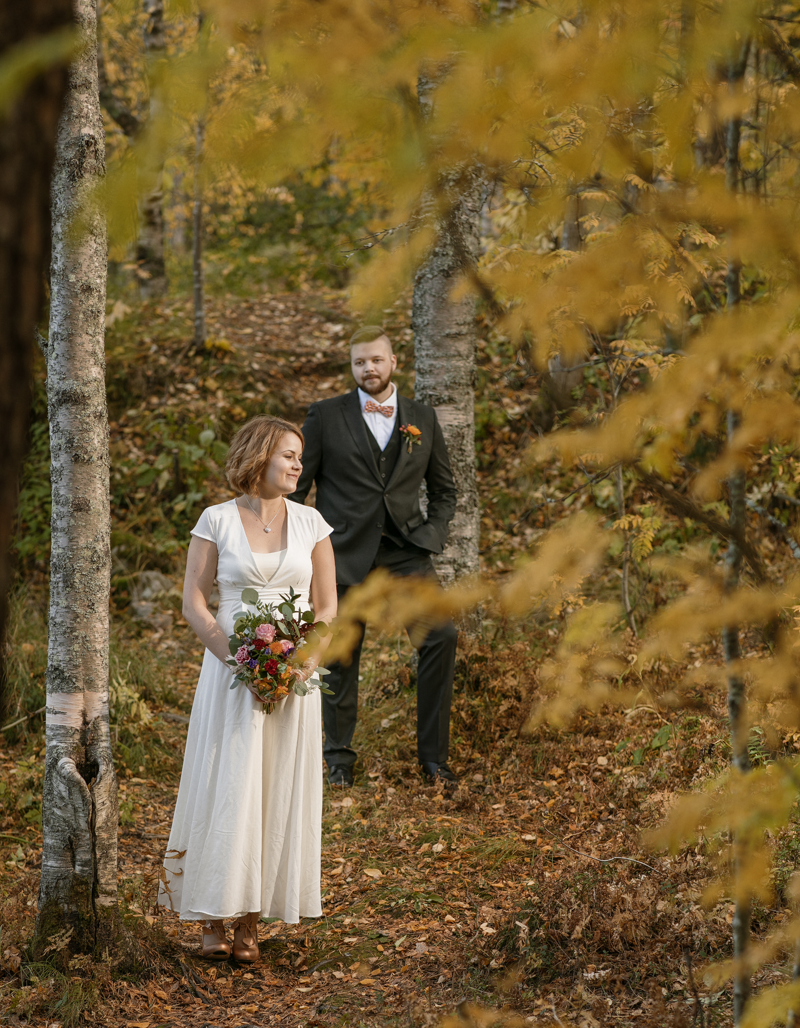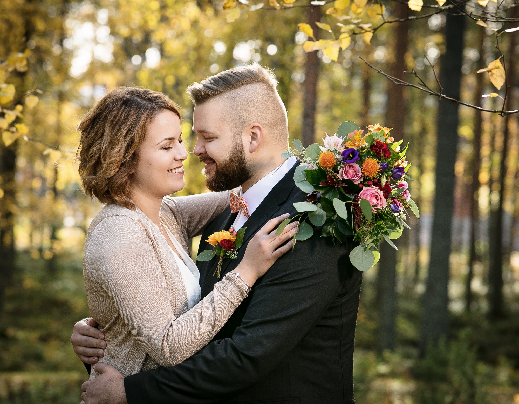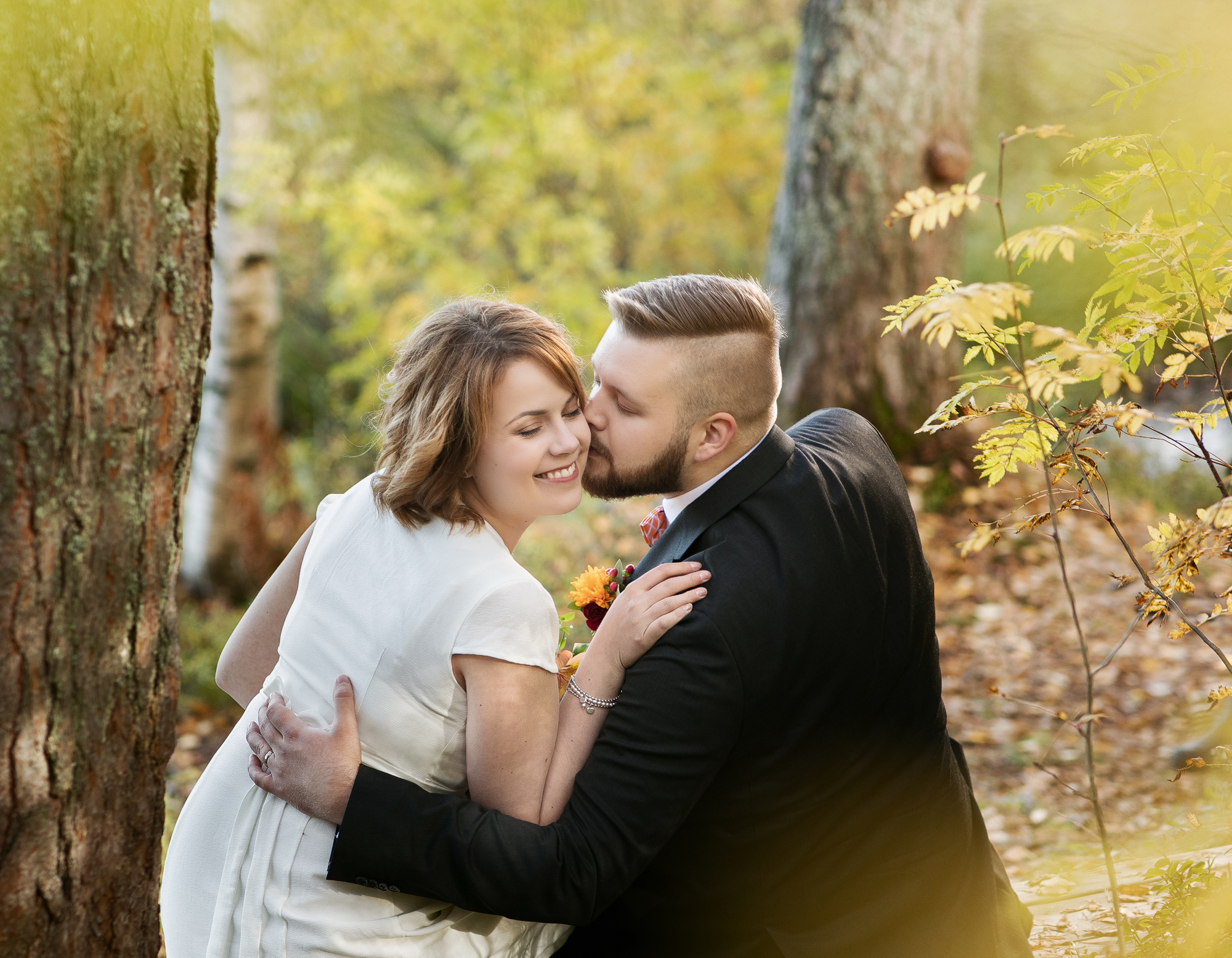 Hääpotretit kuvattiin syksyisessä metsässä, ihanan kiireettömissä tunnelmissa intiimin vihkitilaisuuden jälkeen. Syksyn kuulaat sävyt ja kaunis sää antoivat upeat puitteet kuvaukseen.
