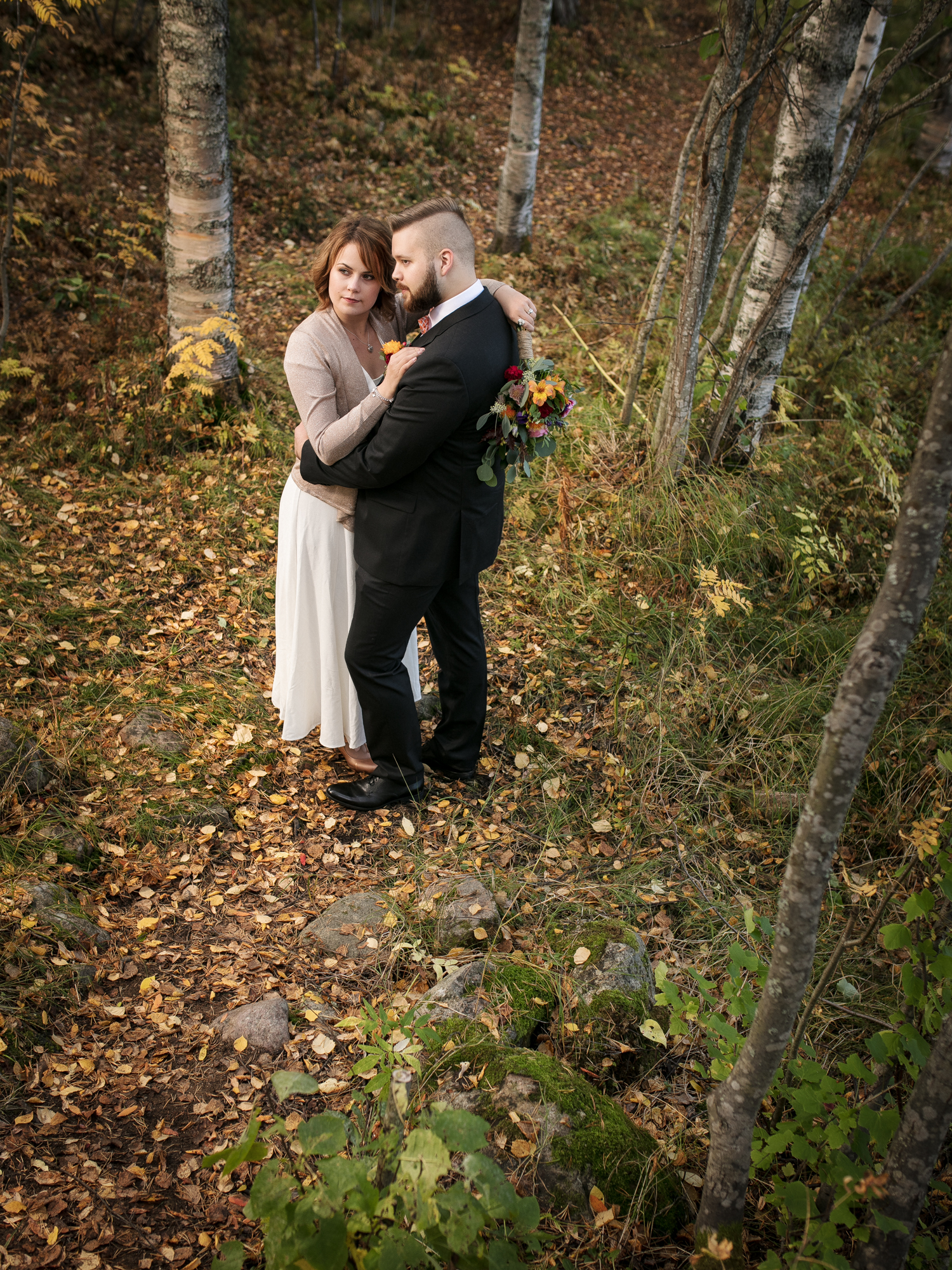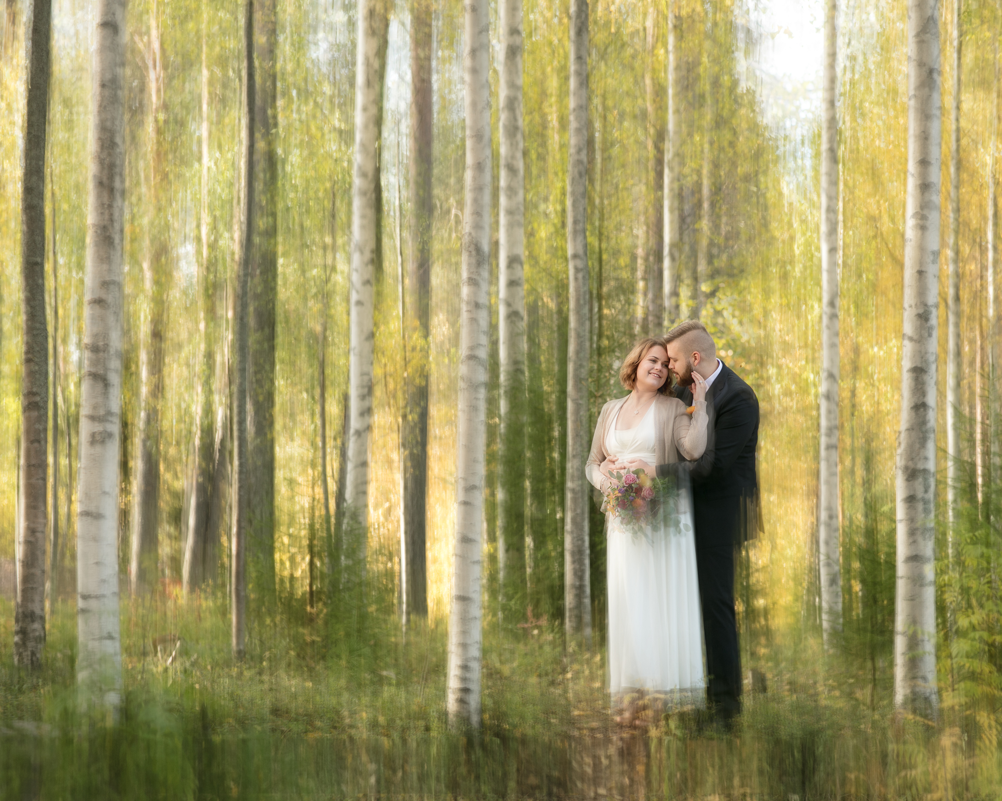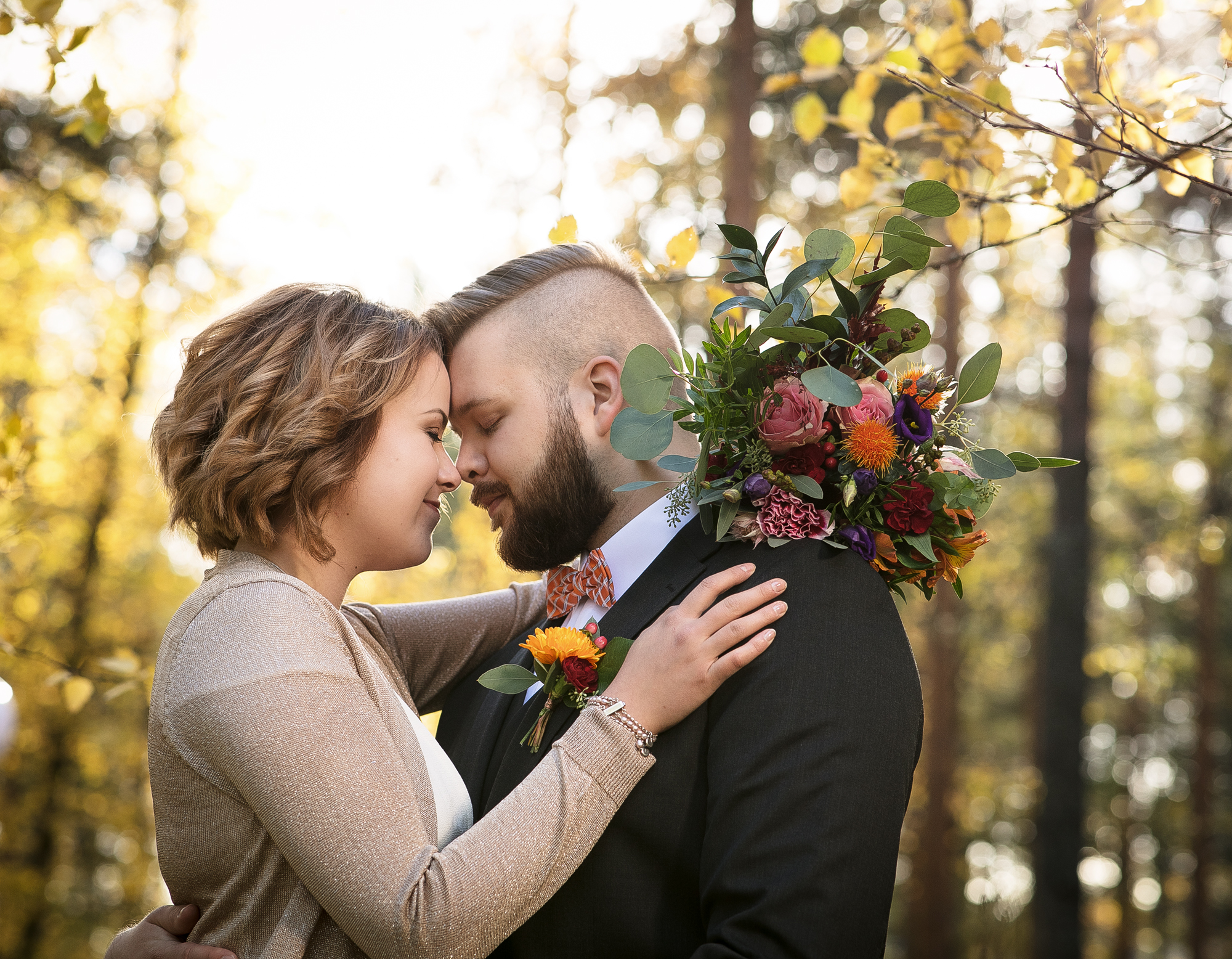 Hääpotretit kuvattiin syksyisessä metsässä, ihanan kiireettömissä tunnelmissa intiimin vihkitilaisuuden jälkeen. Syksyn kuulaat sävyt ja kaunis sää antoivat upeat puitteet kuvaukseen.