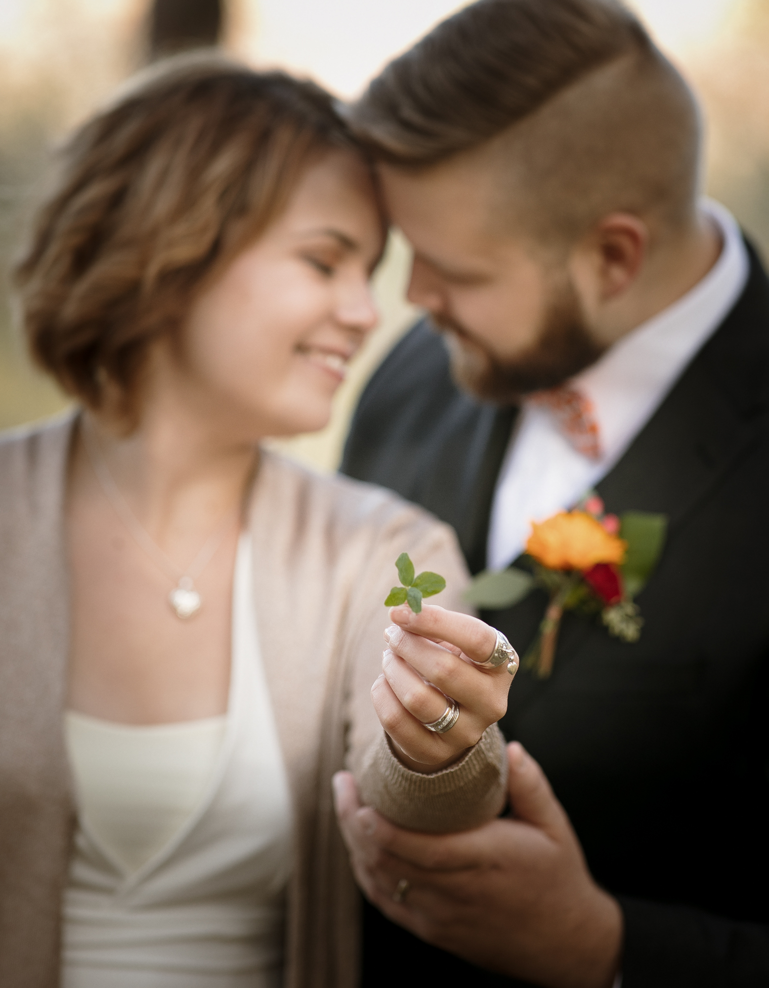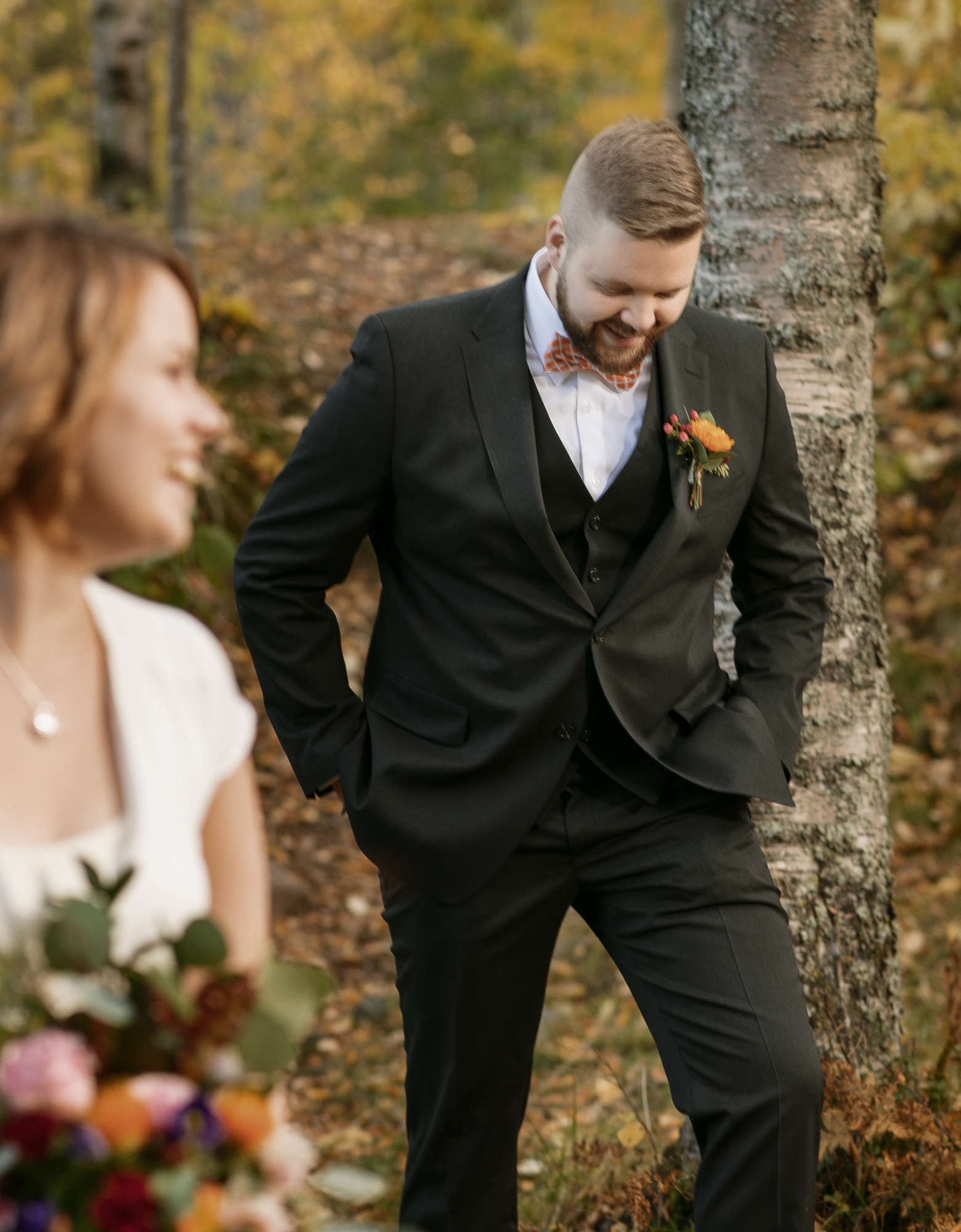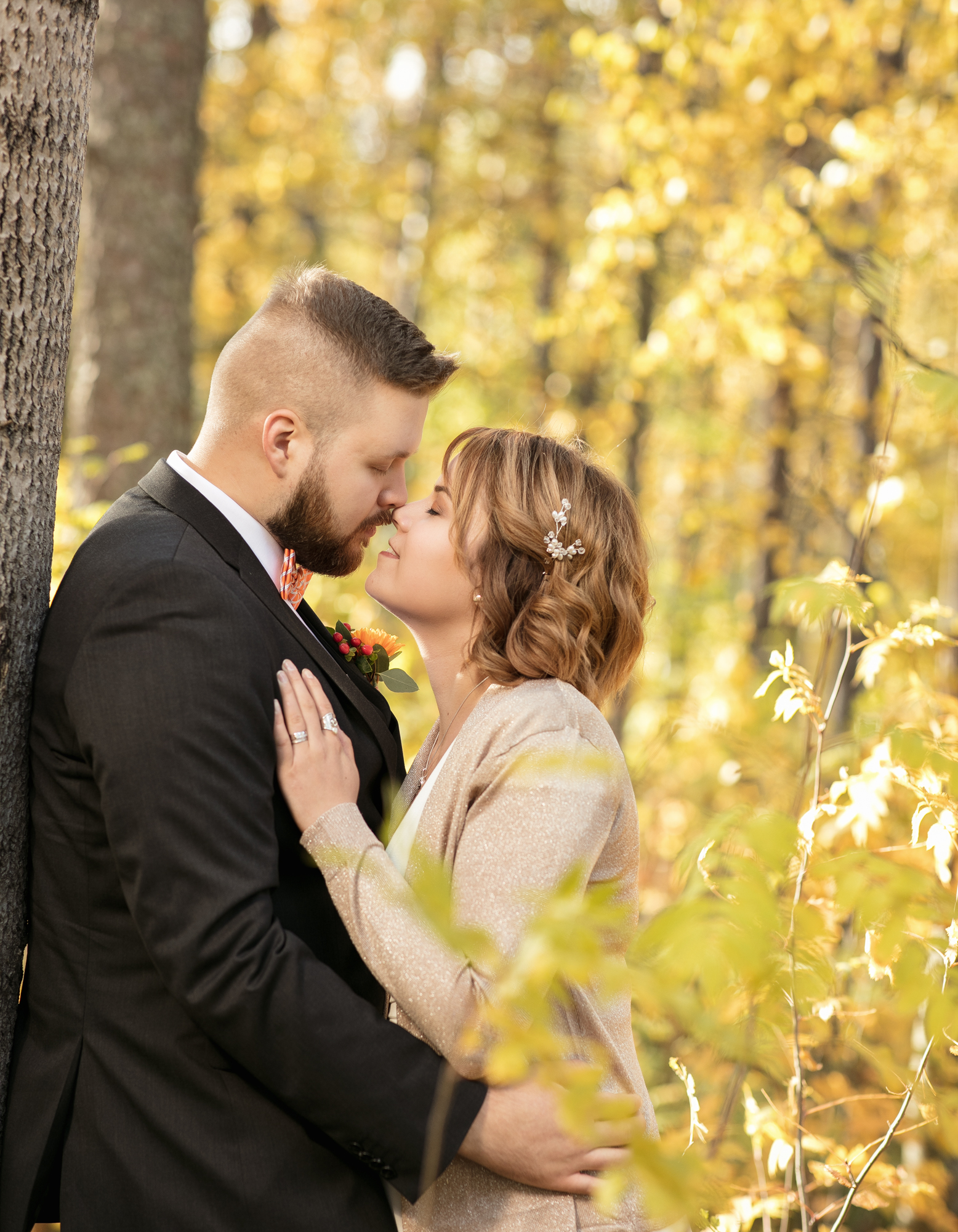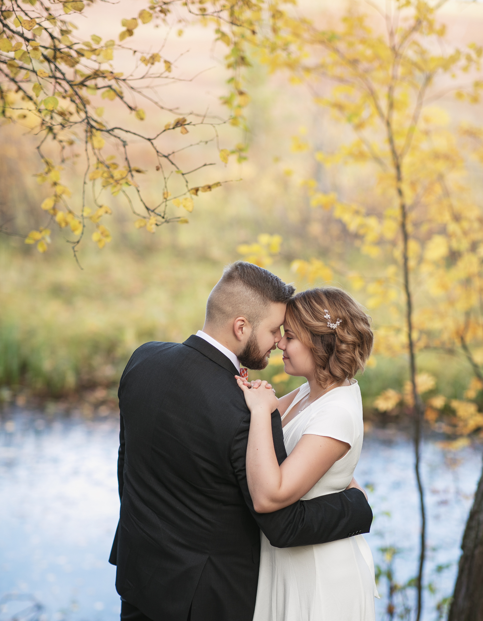Hääpotretit kuvattiin syksyisessä metsässä, ihanan kiireettömissä tunnelmissa intiimin vihkitilaisuuden jälkeen. Syksyn kuulaat sävyt ja kaunis sää antoivat upeat puitteet kuvaukseen.