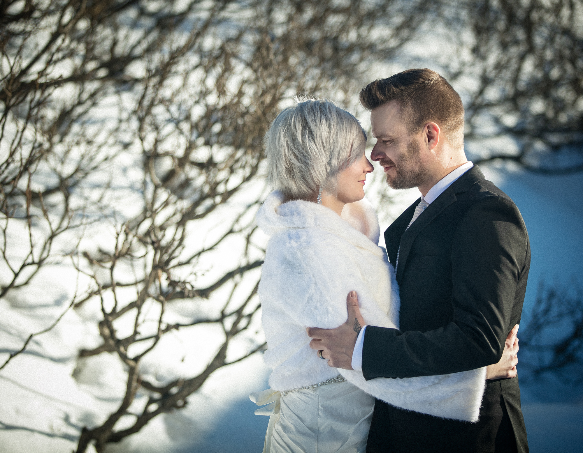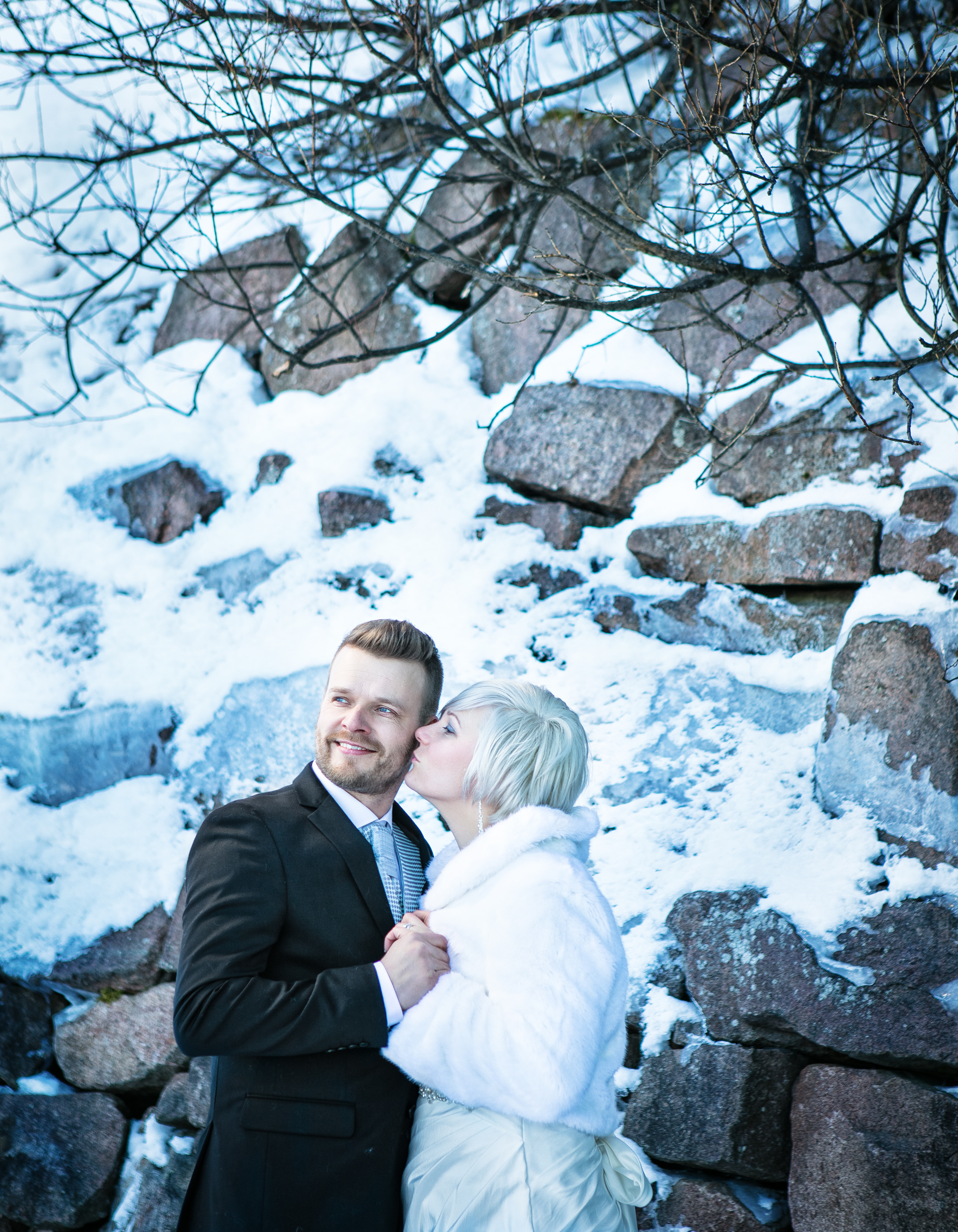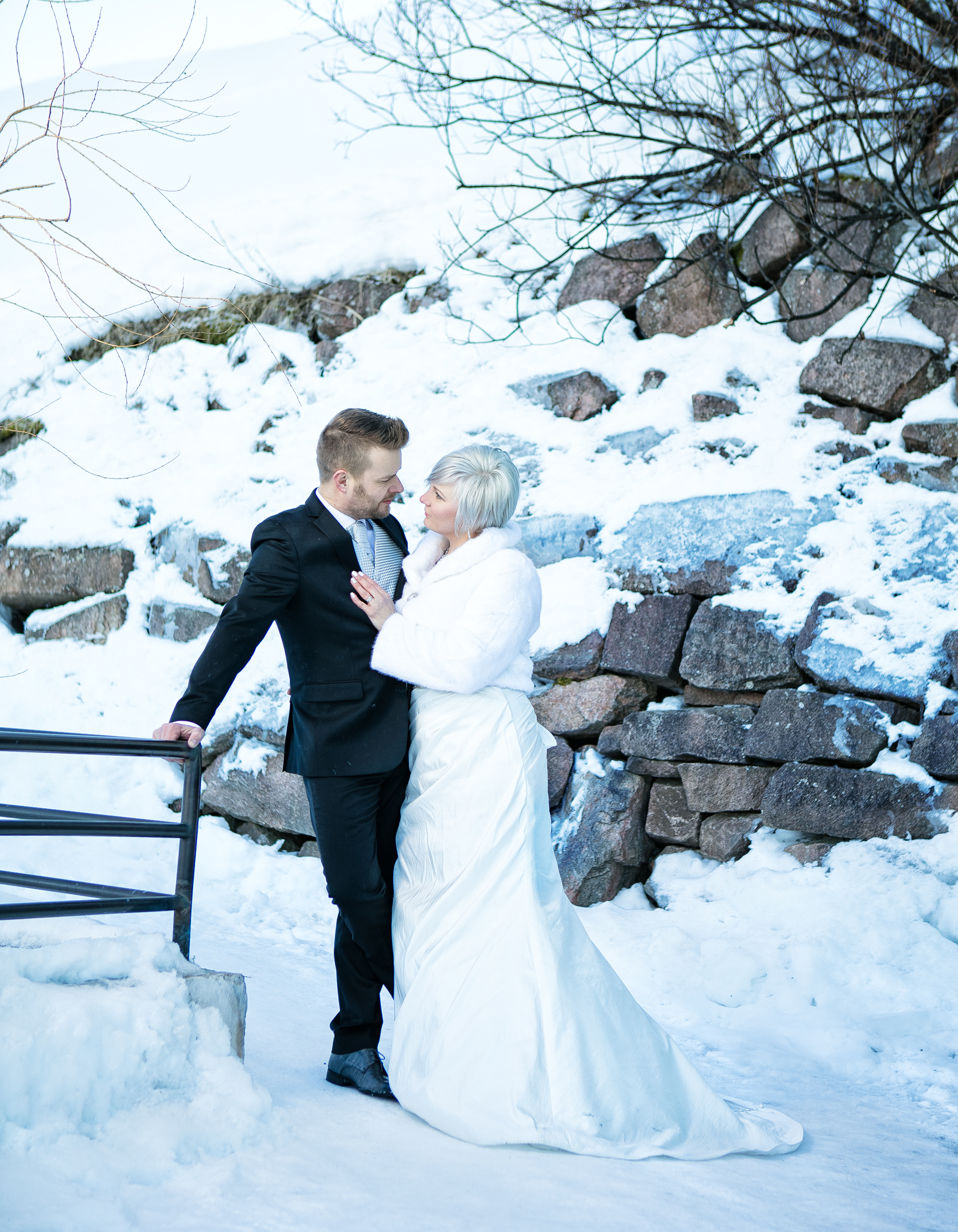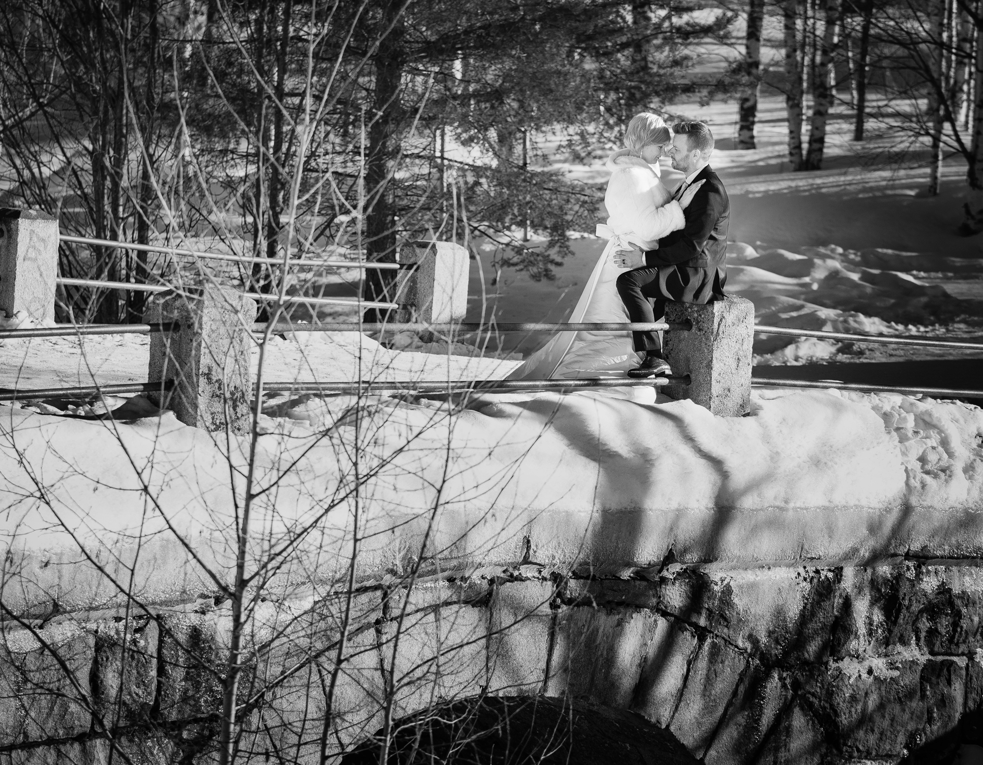 Hääpari pistäytyi potrettikuvauksessa pohjoisella häämatkallaan. Ihana kohtaaminen upean parin kanssa talvisessa Arktikumin puistossa Rovaniemellä.