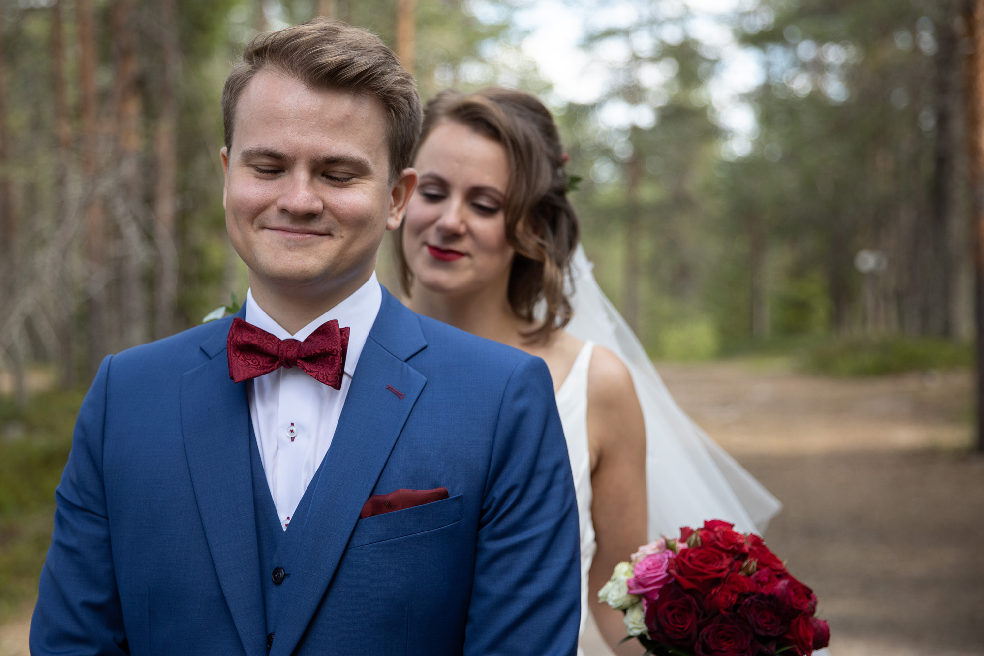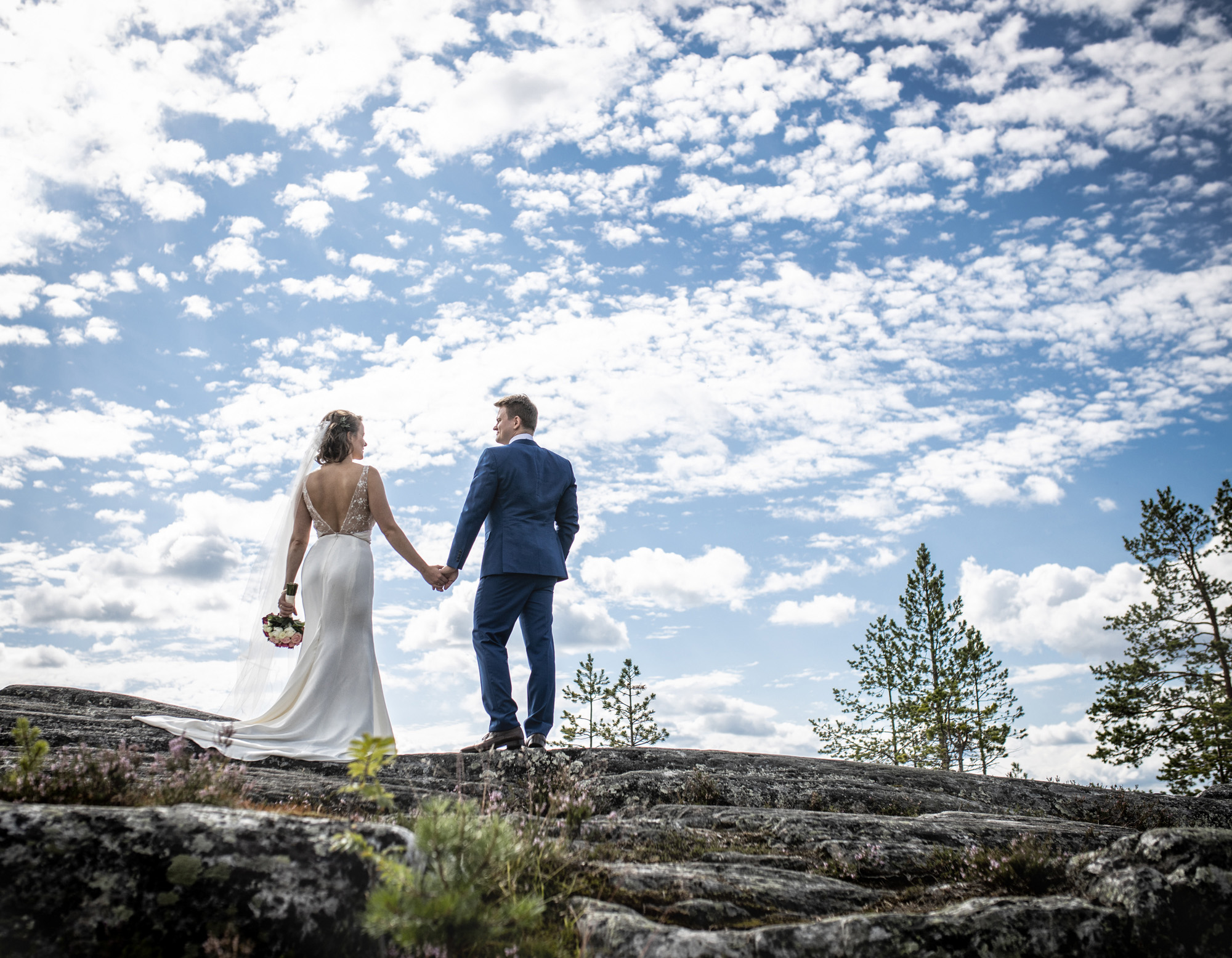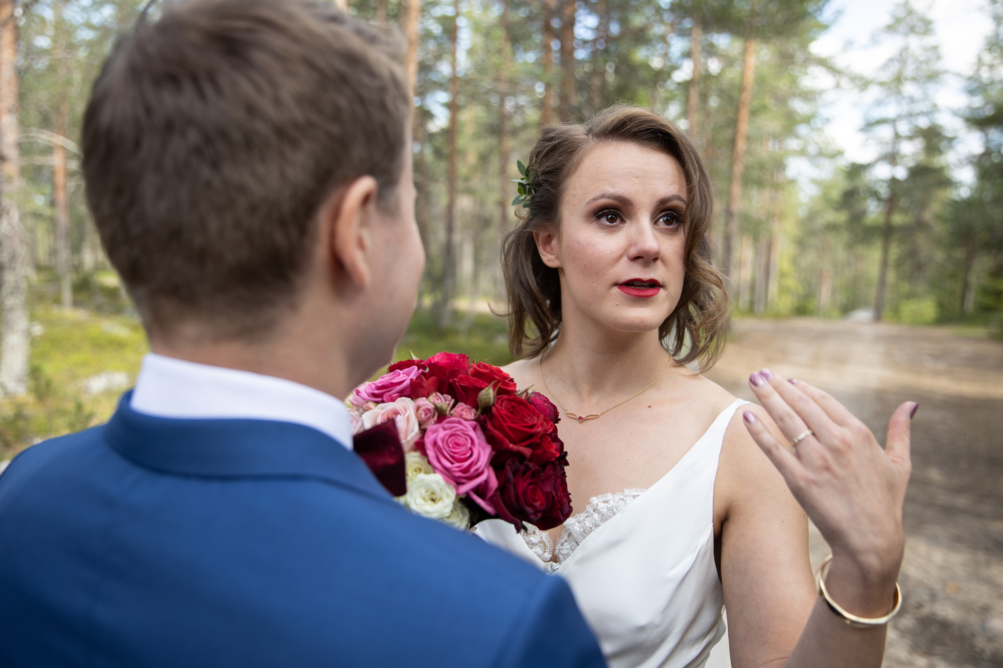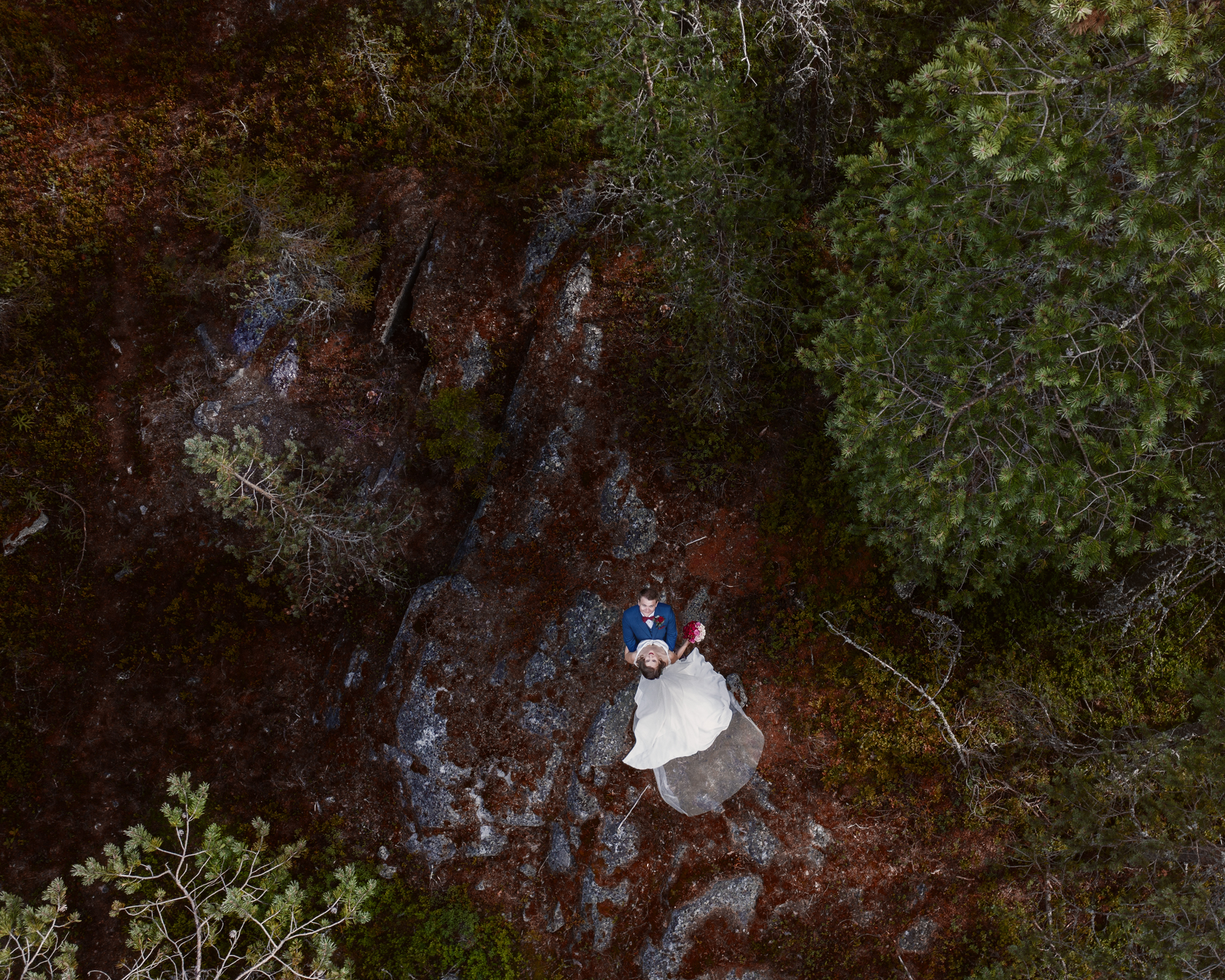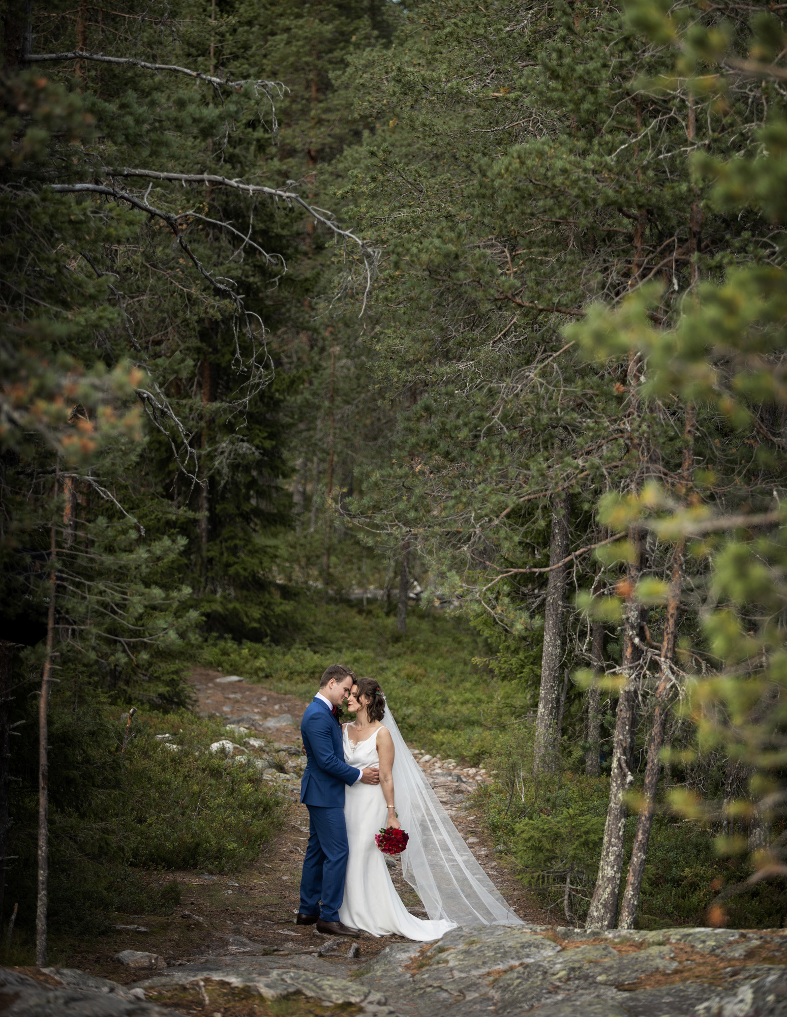 Reetan ja Turkan kuvauksen aloitimme firstlookilla potrettikuvauspaikaksemme valikoituneella Ounasvaaralla. Tykkään kuvata potretit rauhassa ennen vihkimistä, jolloin vihkimisen jälkeen pari voi keskityä juhlimiseen. Firstlookin kuvaamisella ennen potrettikuvausta saa ihanasti taltoitua ne tunteet ja pienetkin eleet, kun pari näkee toisensa ensimmäisen kerran hääpäivänä. Toki pieniä kuvaussessioita voidaan järjestää myös kesken hääjuhlan, mutta suurin osa potreteista on mukava kuvata ilman kiirettä kun paikalla on vain hääpari ja mahdolliset assarit. Metsäinen maisema oli Reetalle ja Turkalle mieleinen ja lisäksi he toivoivat potretteja kuvattavan myös dronella. Tähän tarkoitukseen sopi mainiosti Ounasvaaran kalliot, jotka tarjoavat maanläheisen, rosoisen taustan nostaen parin upeasti esiin. Jonkin aikaa odotimme juuri sopivaa valoa, jotta aurinko kurkisti hieman pilvenreunan takaa. Lopputulos on nähtävillä gallerian viimeisenä ruutuna. Kuvasimme myös muita versioita, mutta tässä drammaattisen romanttisessa kuvassa kallioilla oli mielestämme sitä jotakin. Vihkiminen ja hääjuhla järjestettiin Palojärven lomakeskuksella, jossa kuvasin juhlan tunnelmia iltaan saakka.