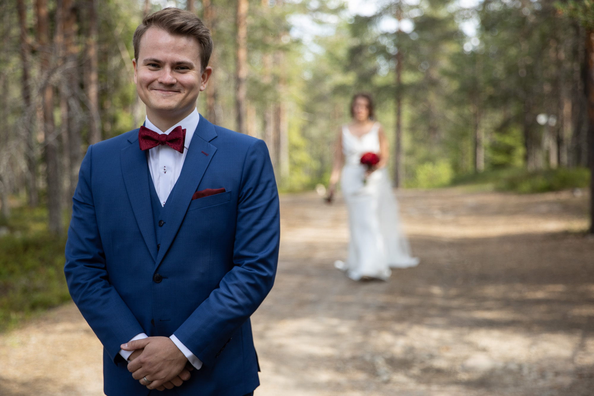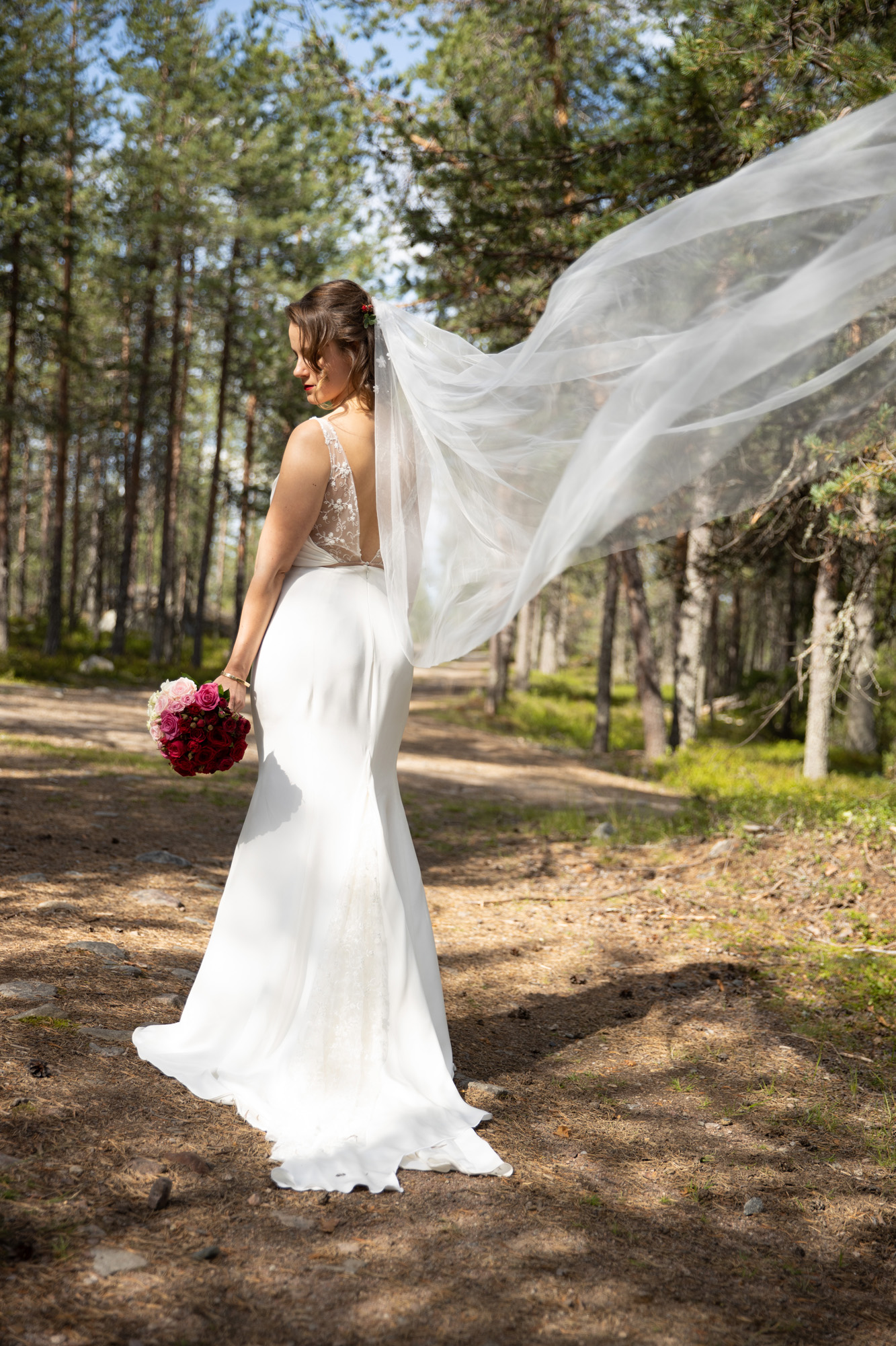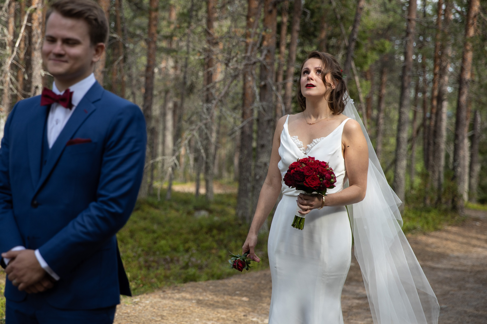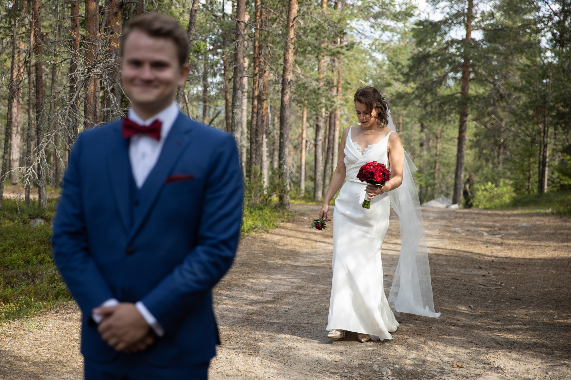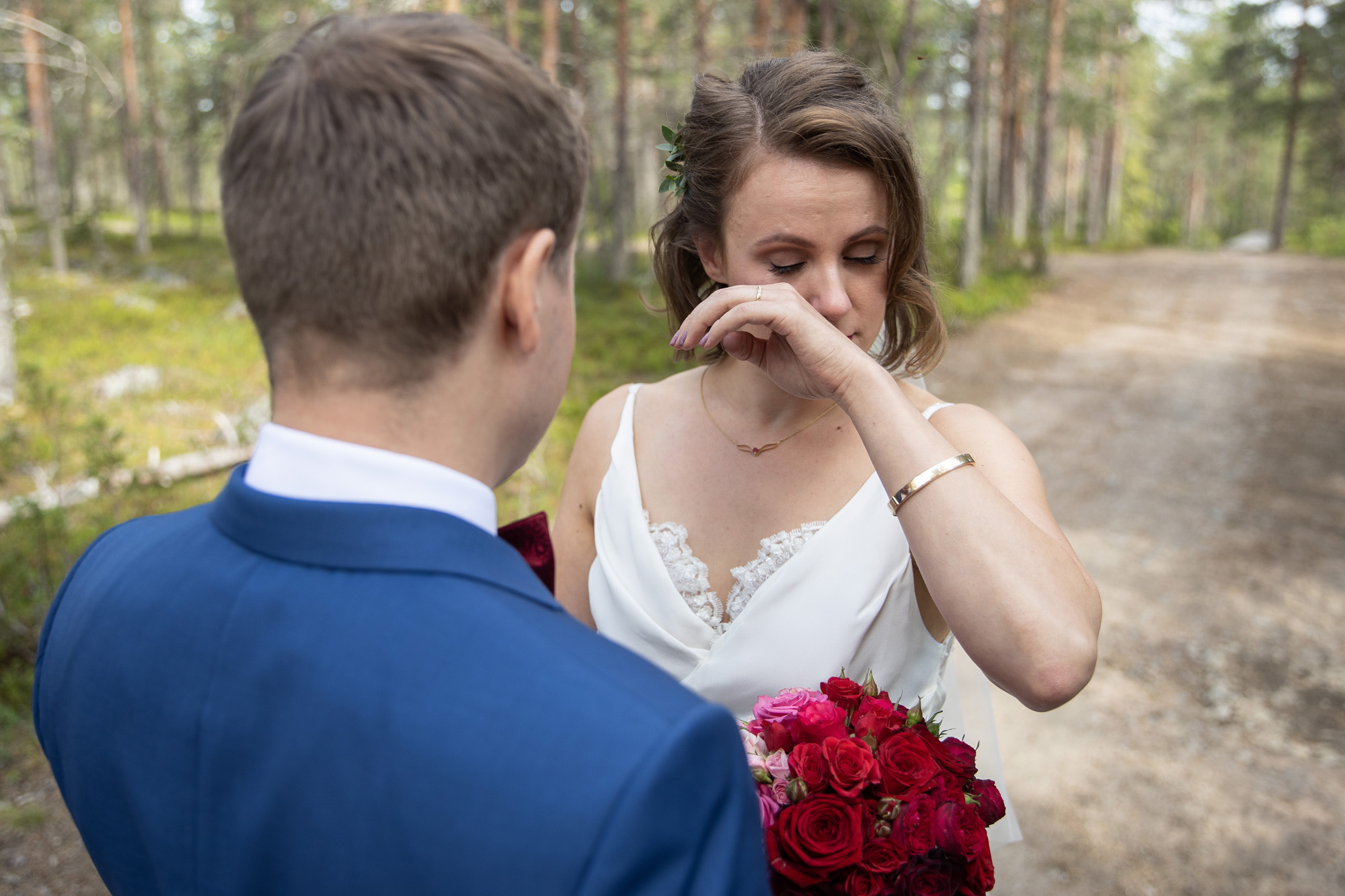 Reetan ja Turkan kuvauksen aloitimme firstlookilla potrettikuvauspaikaksemme valikoituneella Ounasvaaralla. Tykkään kuvata potretit rauhassa ennen vihkimistä, jolloin vihkimisen jälkeen pari voi keskityä juhlimiseen. Firstlookin kuvaamisella ennen potrettikuvausta saa ihanasti taltoitua ne tunteet ja pienetkin eleet, kun pari näkee toisensa ensimmäisen kerran hääpäivänä. Toki pieniä kuvaussessioita voidaan järjestää myös kesken hääjuhlan, mutta suurin osa potreteista on mukava kuvata ilman kiirettä kun paikalla on vain hääpari ja mahdolliset assarit. Metsäinen maisema oli Reetalle ja Turkalle mieleinen ja lisäksi he toivoivat potretteja kuvattavan myös dronella. Tähän tarkoitukseen sopi mainiosti Ounasvaaran kalliot, jotka tarjoavat maanläheisen, rosoisen taustan nostaen parin upeasti esiin. Jonkin aikaa odotimme juuri sopivaa valoa, jotta aurinko kurkisti hieman pilvenreunan takaa. Lopputulos on nähtävillä gallerian viimeisenä ruutuna. Kuvasimme myös muita versioita, mutta tässä drammaattisen romanttisessa kuvassa kallioilla oli mielestämme sitä jotakin. Vihkiminen ja hääjuhla järjestettiin Palojärven lomakeskuksella, jossa kuvasin juhlan tunnelmia iltaan saakka.