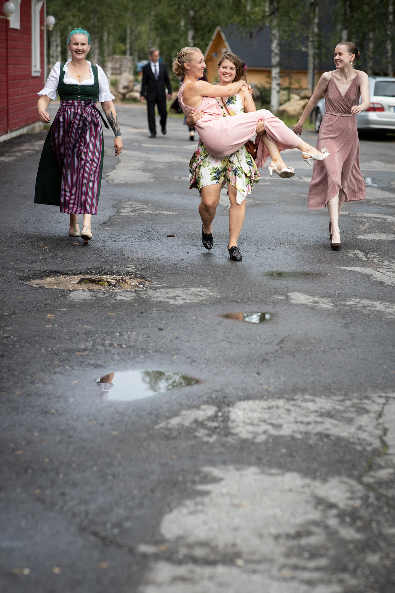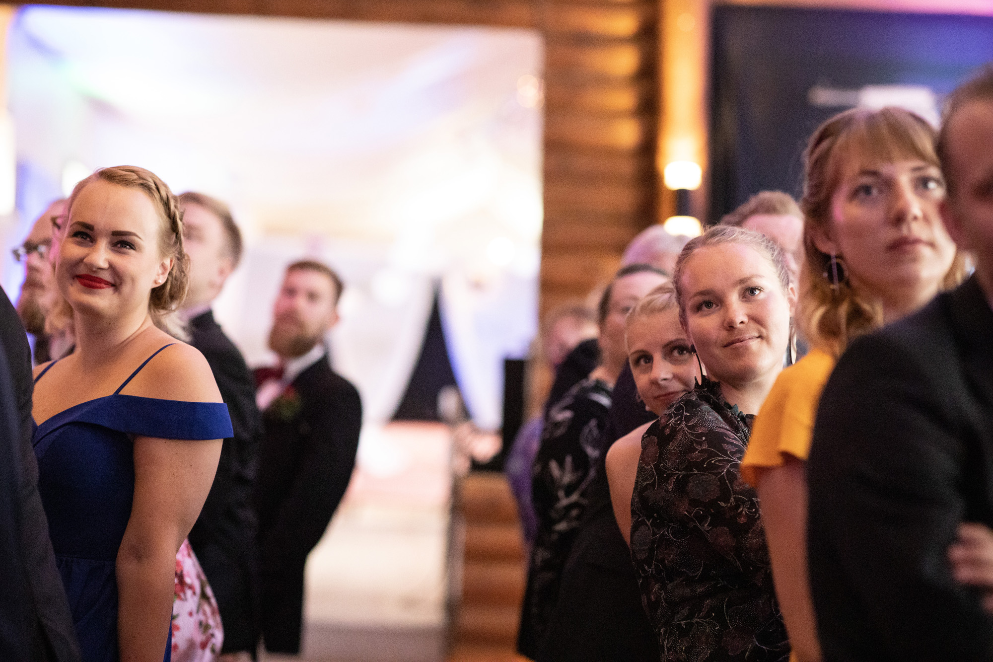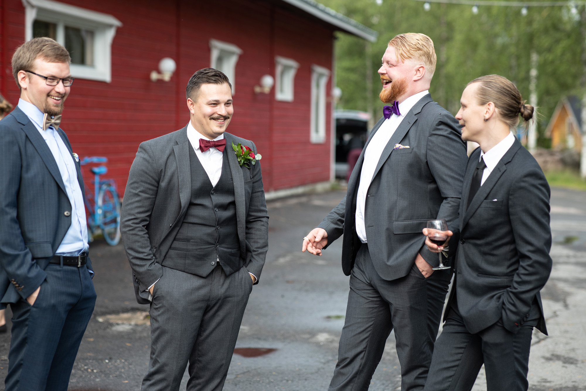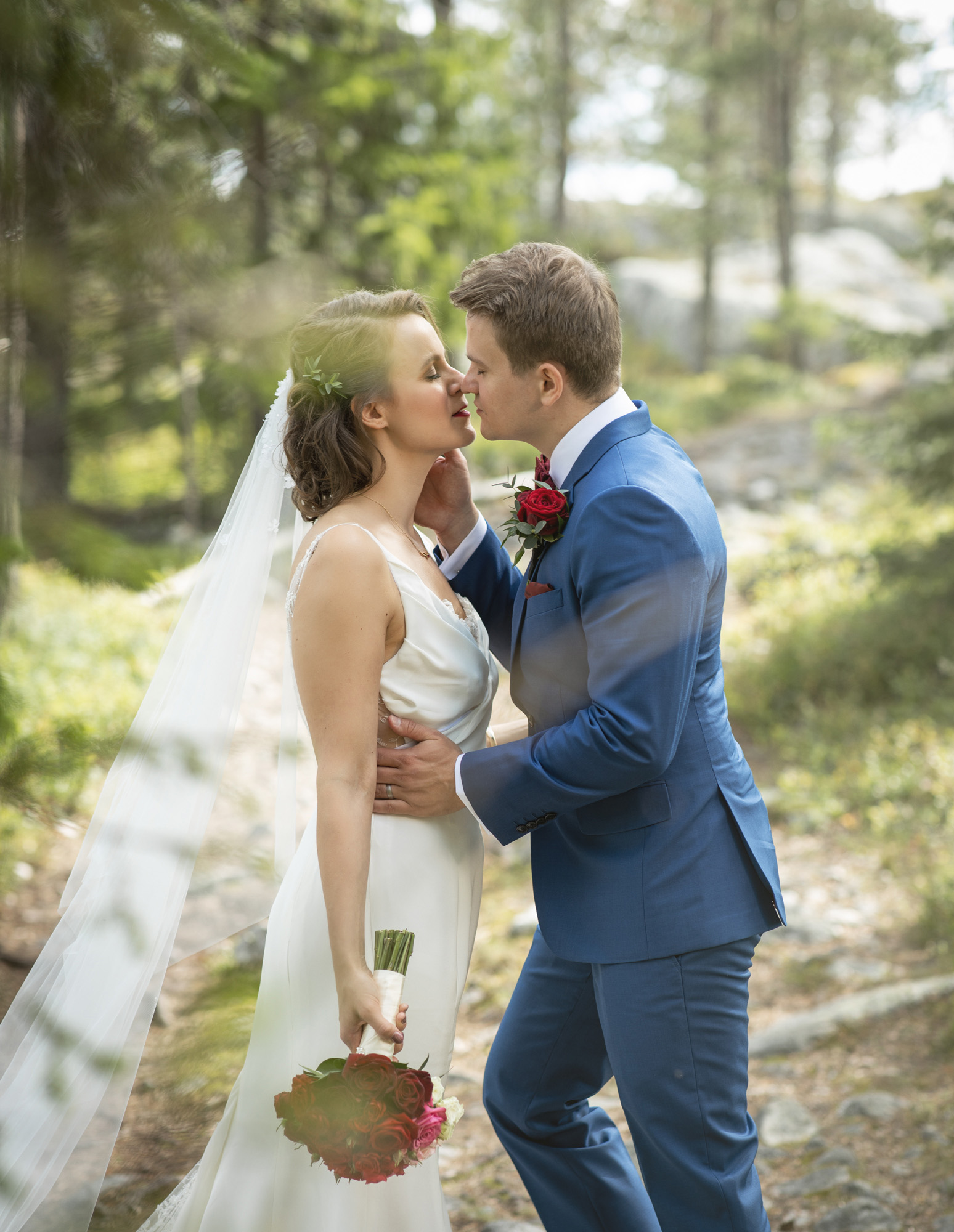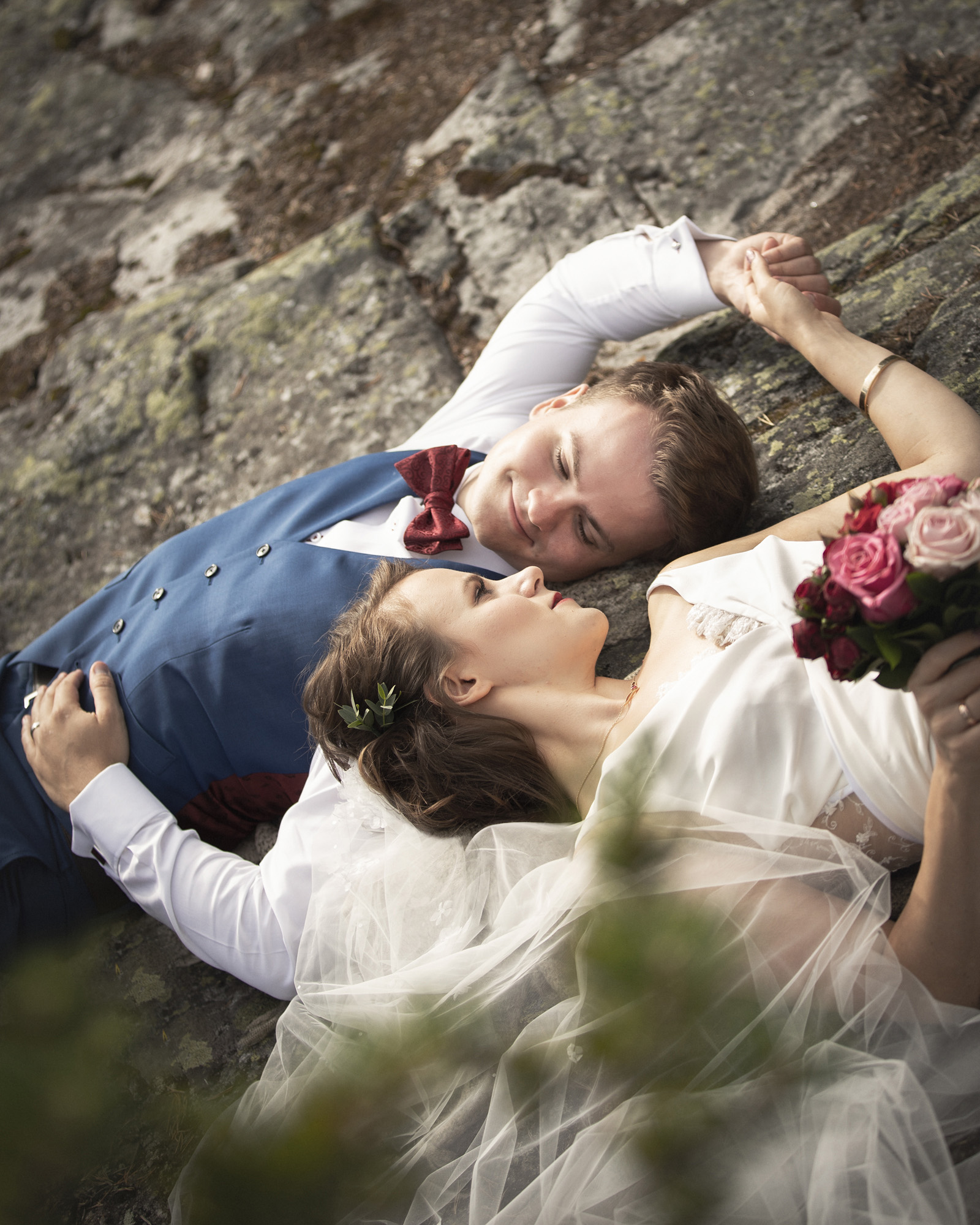 Reetan ja Turkan kuvauksen aloitimme firstlookilla potrettikuvauspaikaksemme valikoituneella Ounasvaaralla. Tykkään kuvata potretit rauhassa ennen vihkimistä, jolloin vihkimisen jälkeen pari voi keskityä juhlimiseen. Firstlookin kuvaamisella ennen potrettikuvausta saa ihanasti taltoitua ne tunteet ja pienetkin eleet, kun pari näkee toisensa ensimmäisen kerran hääpäivänä. Toki pieniä kuvaussessioita voidaan järjestää myös kesken hääjuhlan, mutta suurin osa potreteista on mukava kuvata ilman kiirettä kun paikalla on vain hääpari ja mahdolliset assarit. Metsäinen maisema oli Reetalle ja Turkalle mieleinen ja lisäksi he toivoivat potretteja kuvattavan myös dronella. Tähän tarkoitukseen sopi mainiosti Ounasvaaran kalliot, jotka tarjoavat maanläheisen, rosoisen taustan nostaen parin upeasti esiin. Jonkin aikaa odotimme juuri sopivaa valoa, jotta aurinko kurkisti hieman pilvenreunan takaa. Lopputulos on nähtävillä gallerian viimeisenä ruutuna. Kuvasimme myös muita versioita, mutta tässä drammaattisen romanttisessa kuvassa kallioilla oli mielestämme sitä jotakin. Vihkiminen ja hääjuhla järjestettiin Palojärven lomakeskuksella, jossa kuvasin juhlan tunnelmia iltaan saakka.