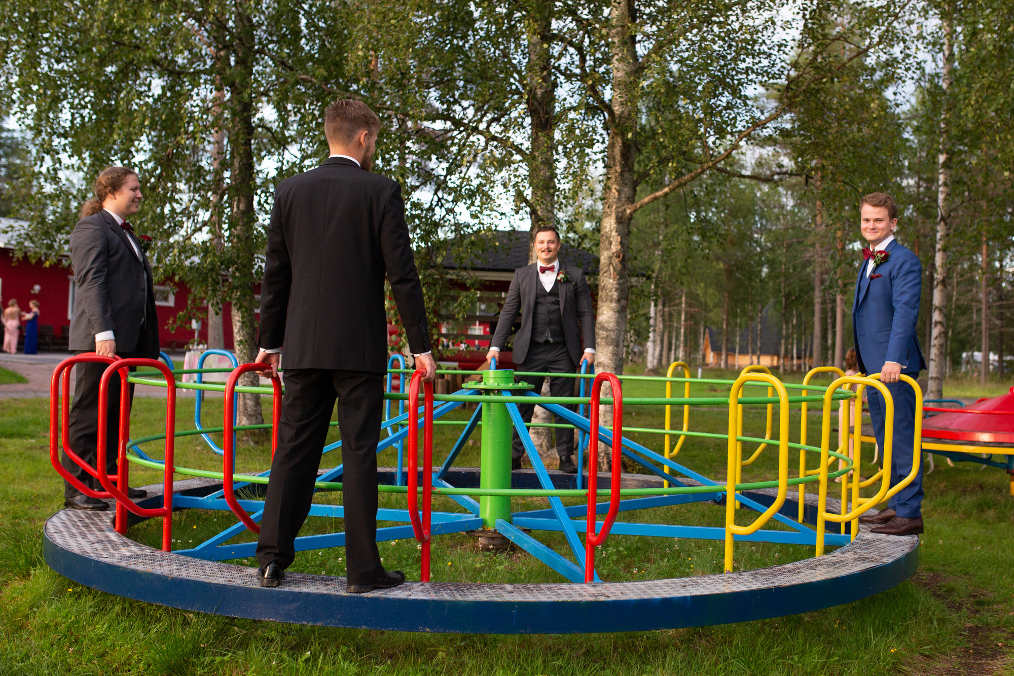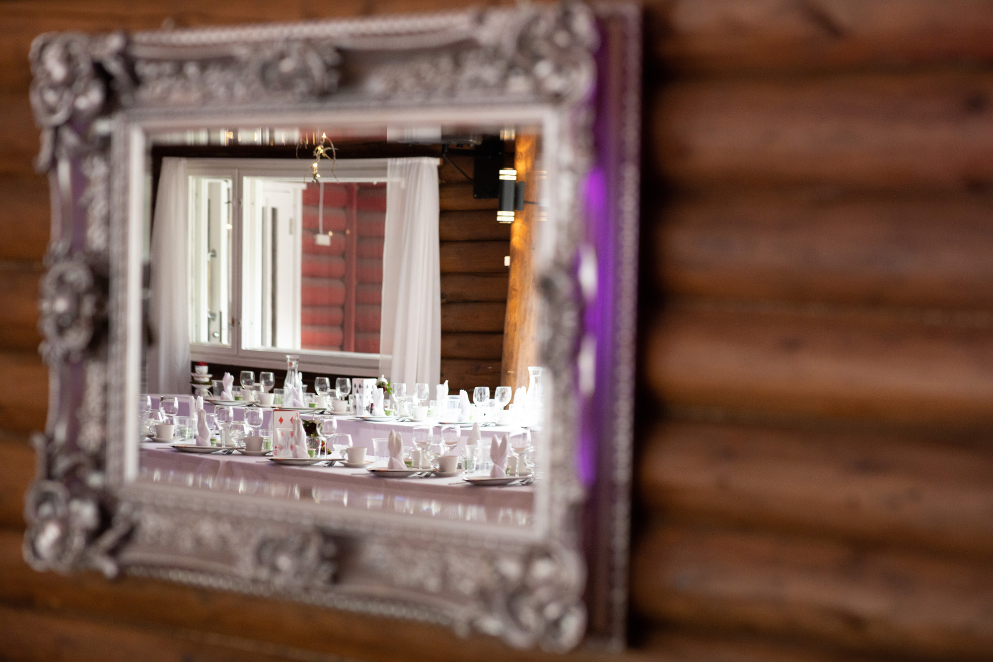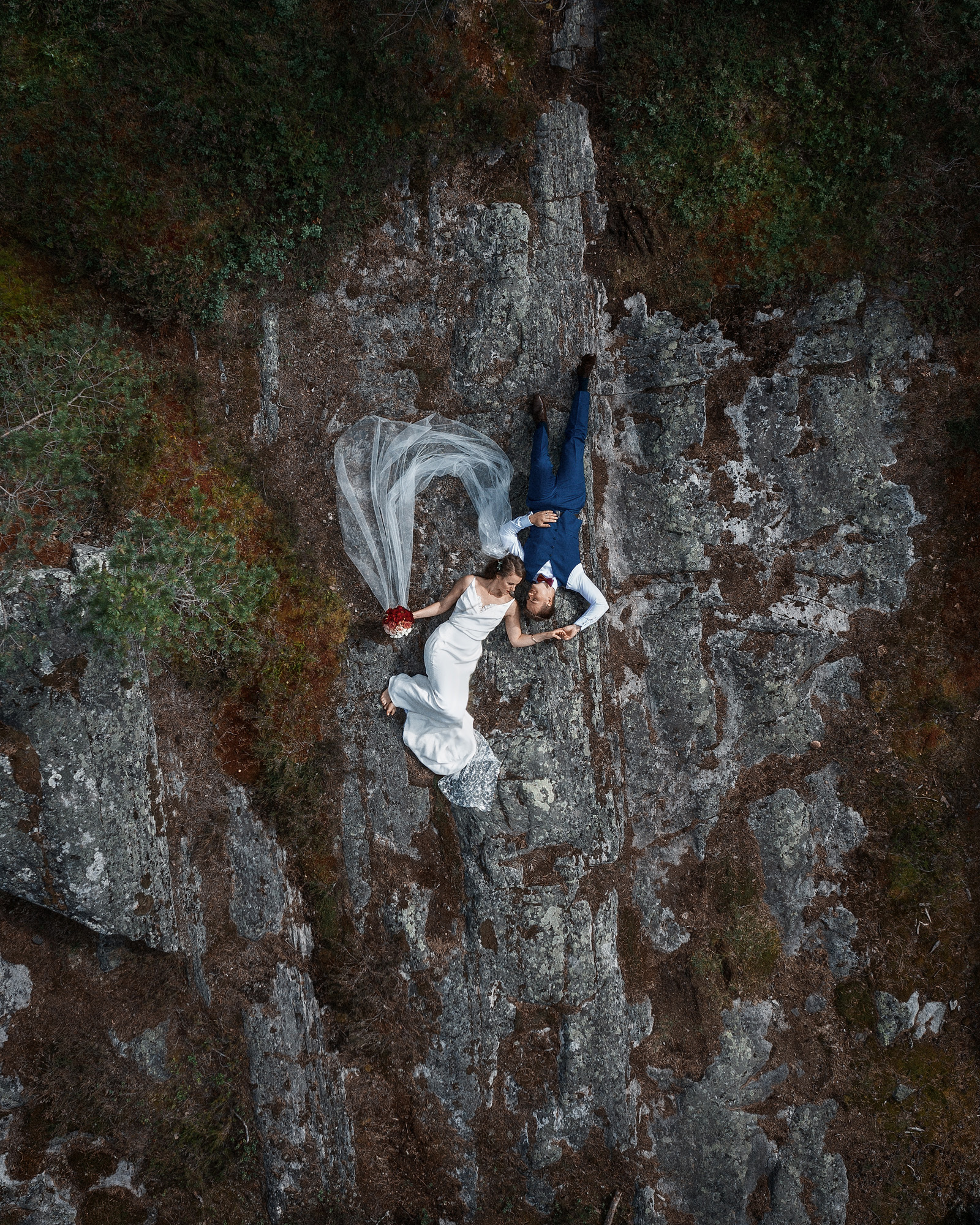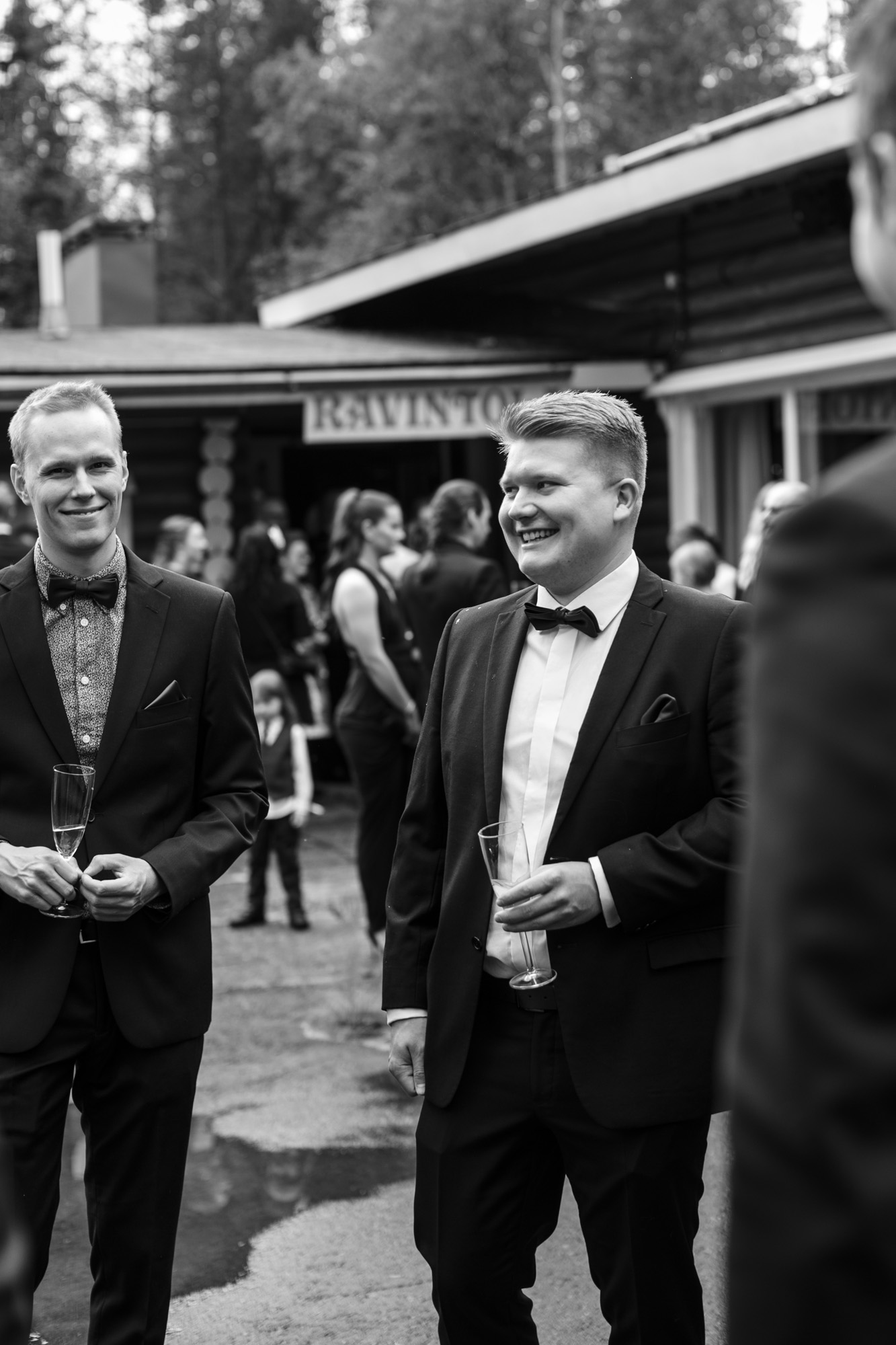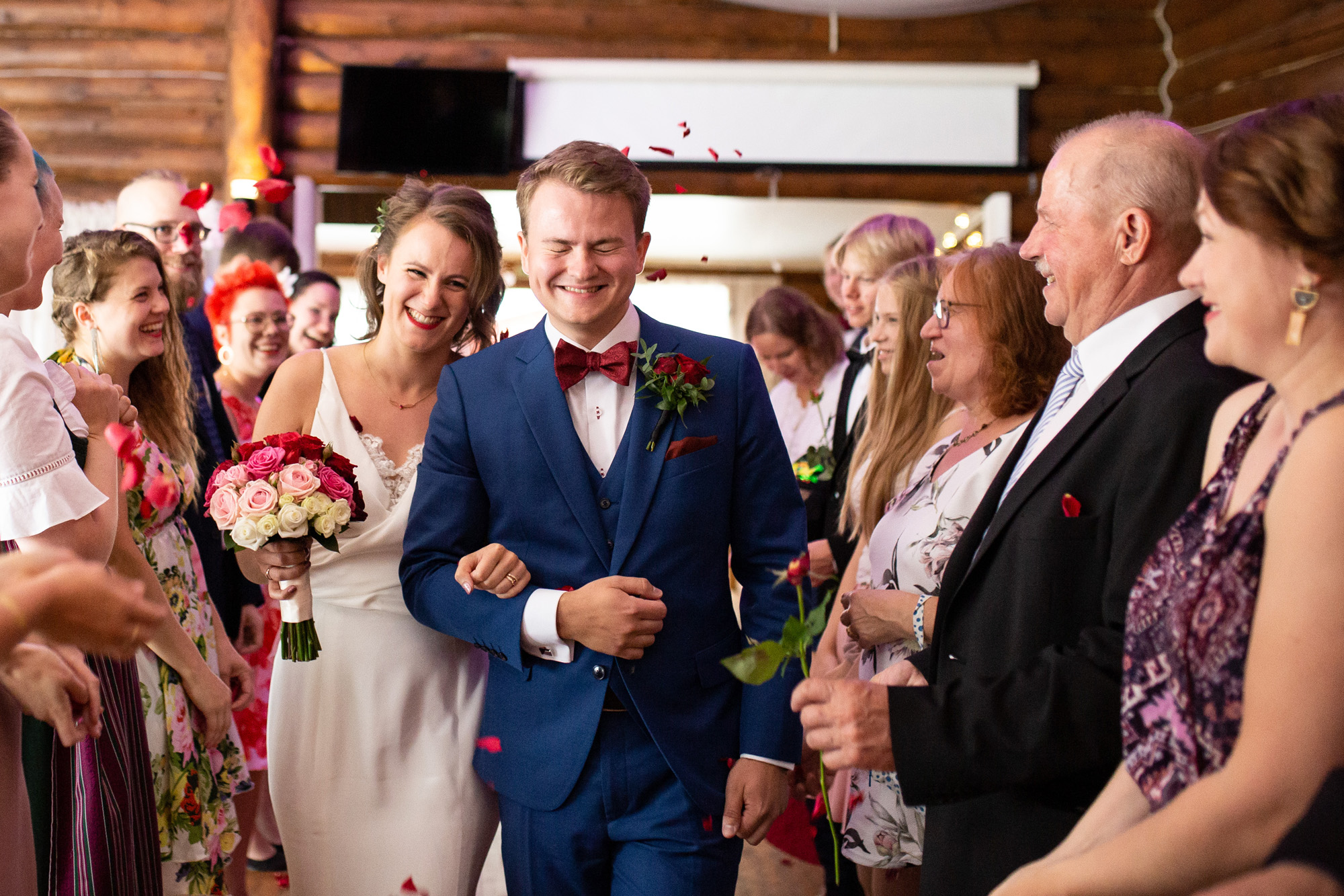 Reetan ja Turkan kuvauksen aloitimme firstlookilla potrettikuvauspaikaksemme valikoituneella Ounasvaaralla. Tykkään kuvata potretit rauhassa ennen vihkimistä, jolloin vihkimisen jälkeen pari voi keskityä juhlimiseen. Firstlookin kuvaamisella ennen potrettikuvausta saa ihanasti taltoitua ne tunteet ja pienetkin eleet, kun pari näkee toisensa ensimmäisen kerran hääpäivänä. Toki pieniä kuvaussessioita voidaan järjestää myös kesken hääjuhlan, mutta suurin osa potreteista on mukava kuvata ilman kiirettä kun paikalla on vain hääpari ja mahdolliset assarit. Metsäinen maisema oli Reetalle ja Turkalle mieleinen ja lisäksi he toivoivat potretteja kuvattavan myös dronella. Tähän tarkoitukseen sopi mainiosti Ounasvaaran kalliot, jotka tarjoavat maanläheisen, rosoisen taustan nostaen parin upeasti esiin. Jonkin aikaa odotimme juuri sopivaa valoa, jotta aurinko kurkisti hieman pilvenreunan takaa. Lopputulos on nähtävillä gallerian viimeisenä ruutuna. Kuvasimme myös muita versioita, mutta tässä drammaattisen romanttisessa kuvassa kallioilla oli mielestämme sitä jotakin. Vihkiminen ja hääjuhla järjestettiin Palojärven lomakeskuksella, jossa kuvasin juhlan tunnelmia iltaan saakka.