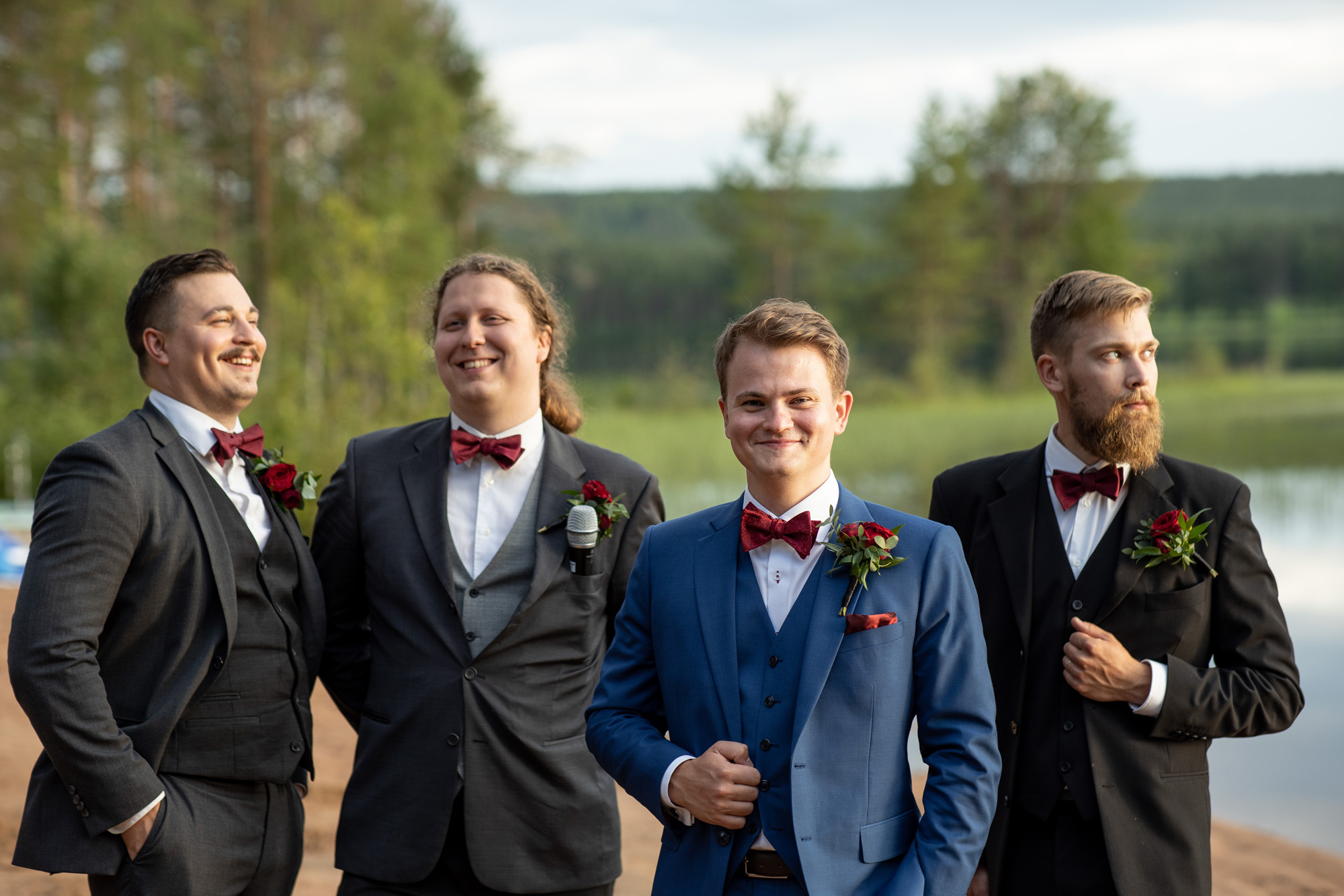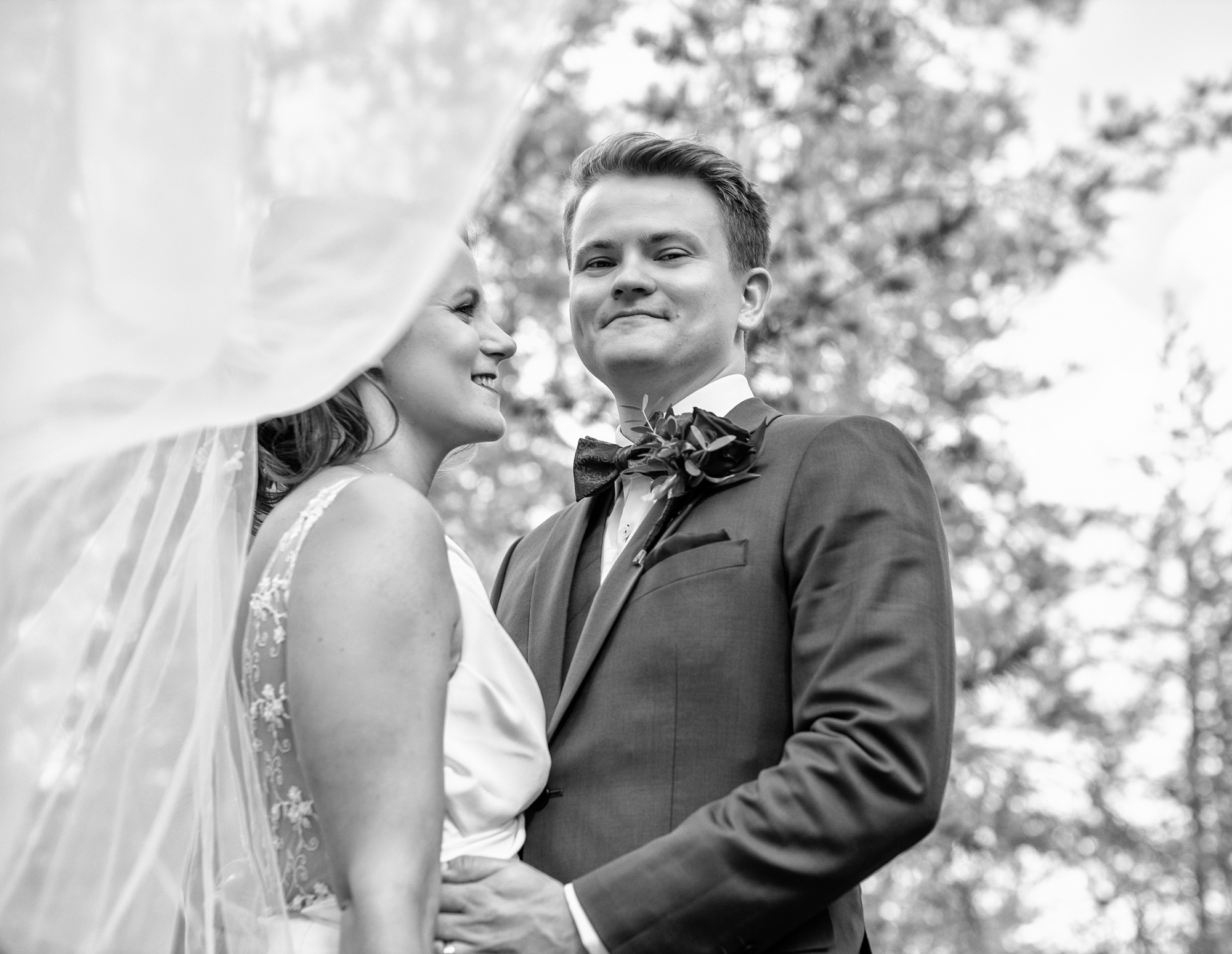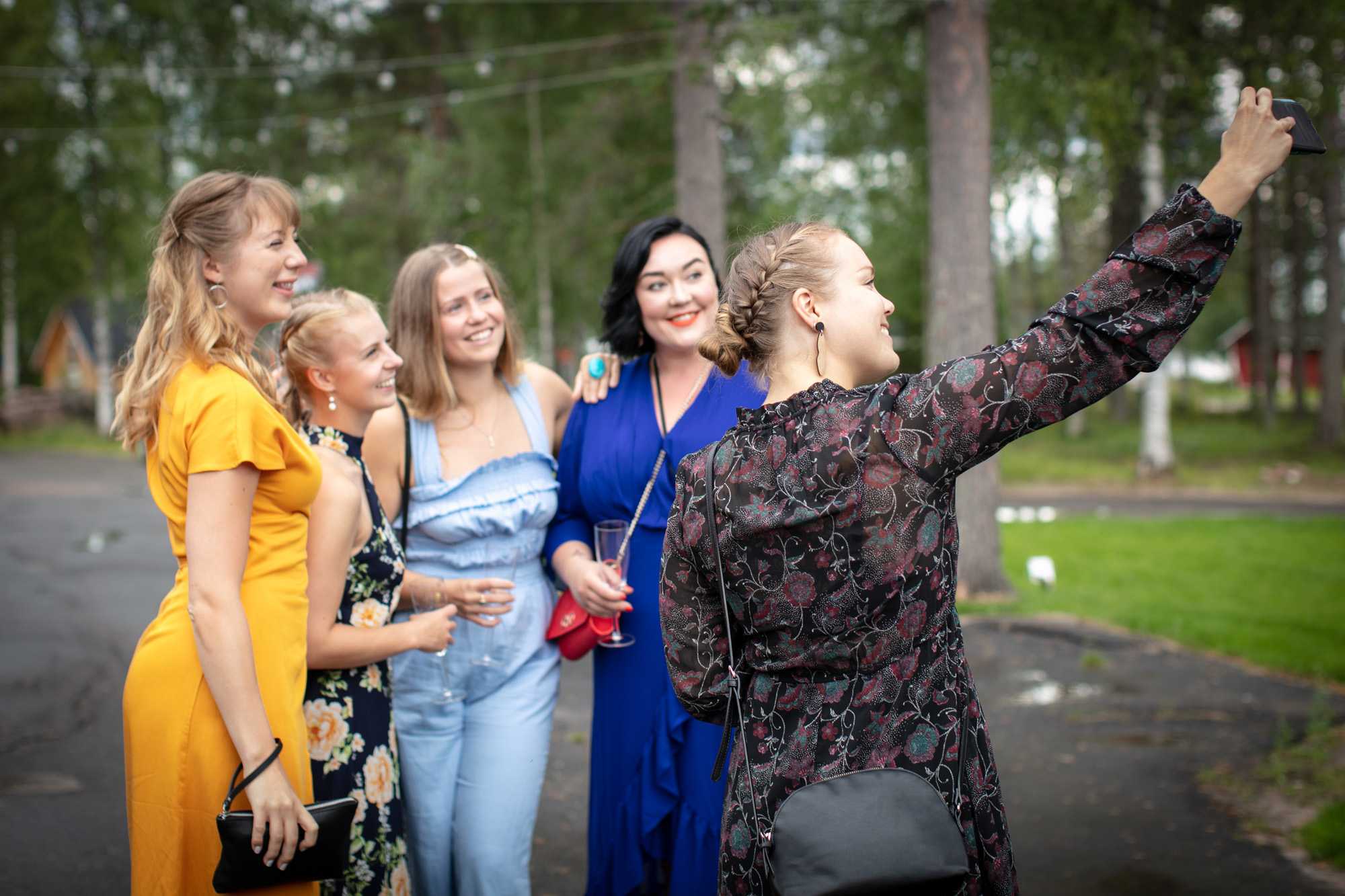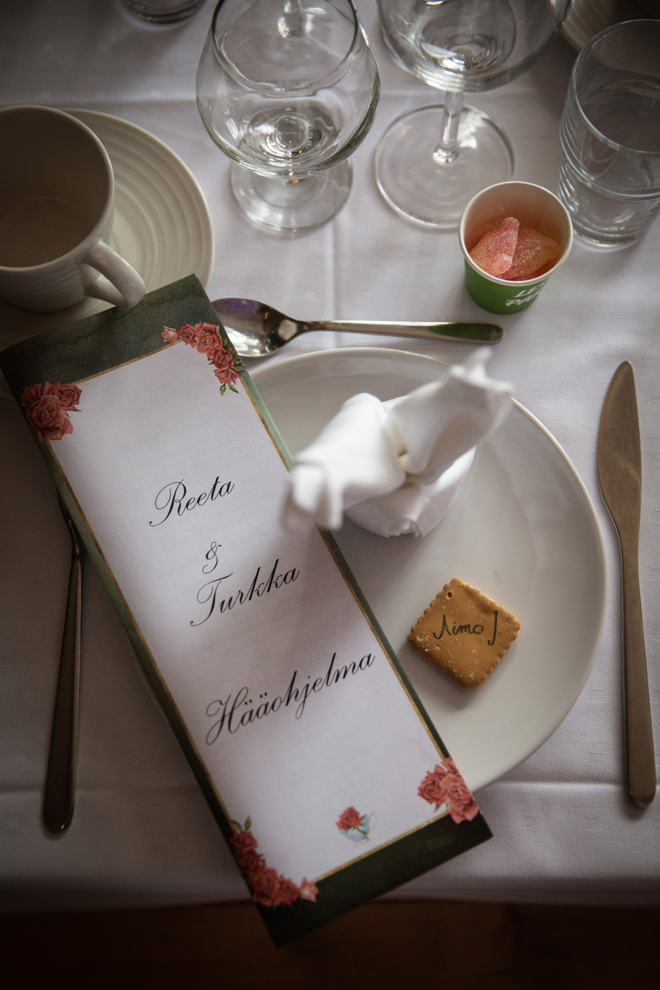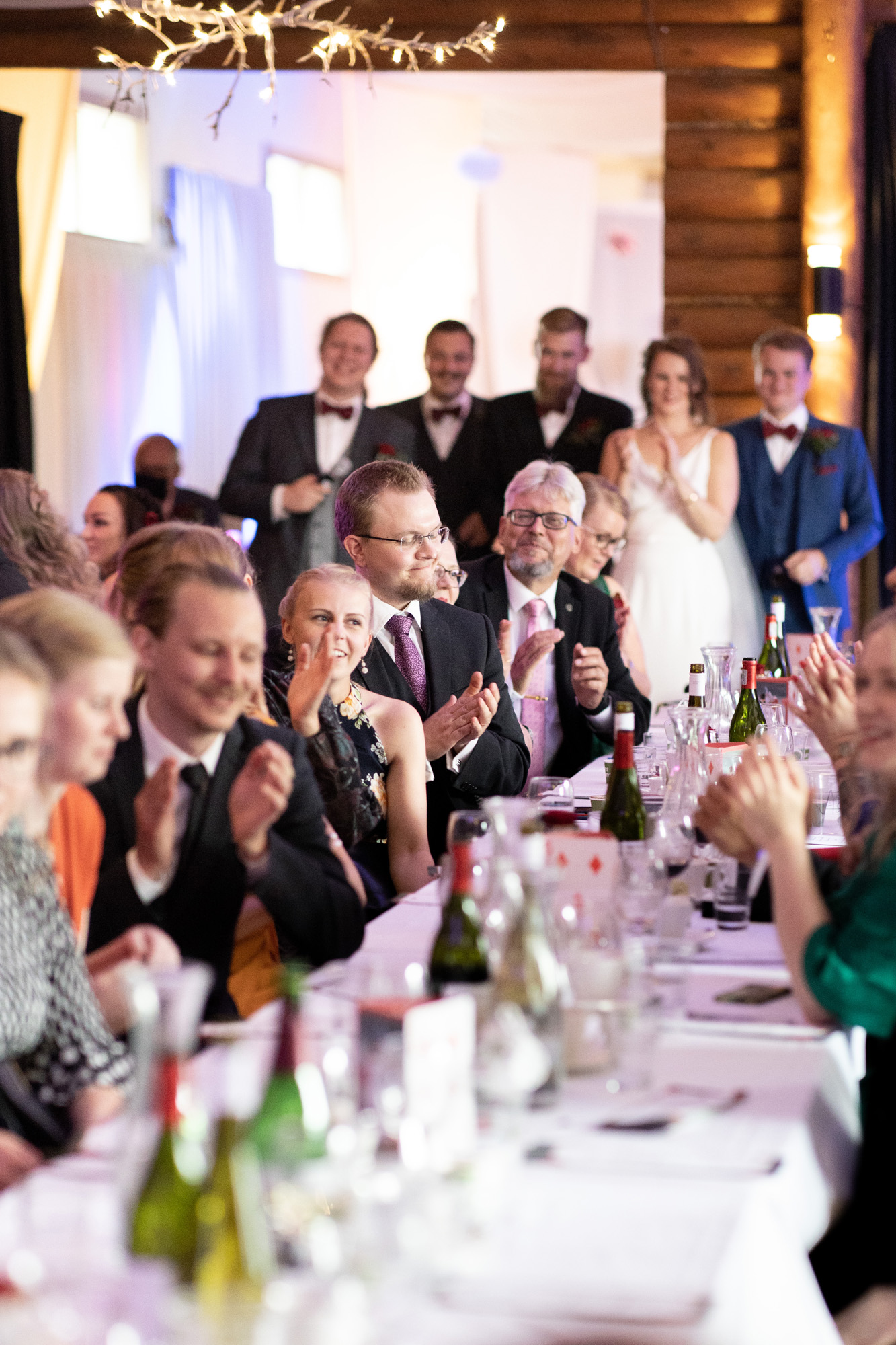 Reetan ja Turkan kuvauksen aloitimme firstlookilla potrettikuvauspaikaksemme valikoituneella Ounasvaaralla. Tykkään kuvata potretit rauhassa ennen vihkimistä, jolloin vihkimisen jälkeen pari voi keskityä juhlimiseen. Firstlookin kuvaamisella ennen potrettikuvausta saa ihanasti taltoitua ne tunteet ja pienetkin eleet, kun pari näkee toisensa ensimmäisen kerran hääpäivänä. Toki pieniä kuvaussessioita voidaan järjestää myös kesken hääjuhlan, mutta suurin osa potreteista on mukava kuvata ilman kiirettä kun paikalla on vain hääpari ja mahdolliset assarit. Metsäinen maisema oli Reetalle ja Turkalle mieleinen ja lisäksi he toivoivat potretteja kuvattavan myös dronella. Tähän tarkoitukseen sopi mainiosti Ounasvaaran kalliot, jotka tarjoavat maanläheisen, rosoisen taustan nostaen parin upeasti esiin. Jonkin aikaa odotimme juuri sopivaa valoa, jotta aurinko kurkisti hieman pilvenreunan takaa. Lopputulos on nähtävillä gallerian viimeisenä ruutuna. Kuvasimme myös muita versioita, mutta tässä drammaattisen romanttisessa kuvassa kallioilla oli mielestämme sitä jotakin. Vihkiminen ja hääjuhla järjestettiin Palojärven lomakeskuksella, jossa kuvasin juhlan tunnelmia iltaan saakka.