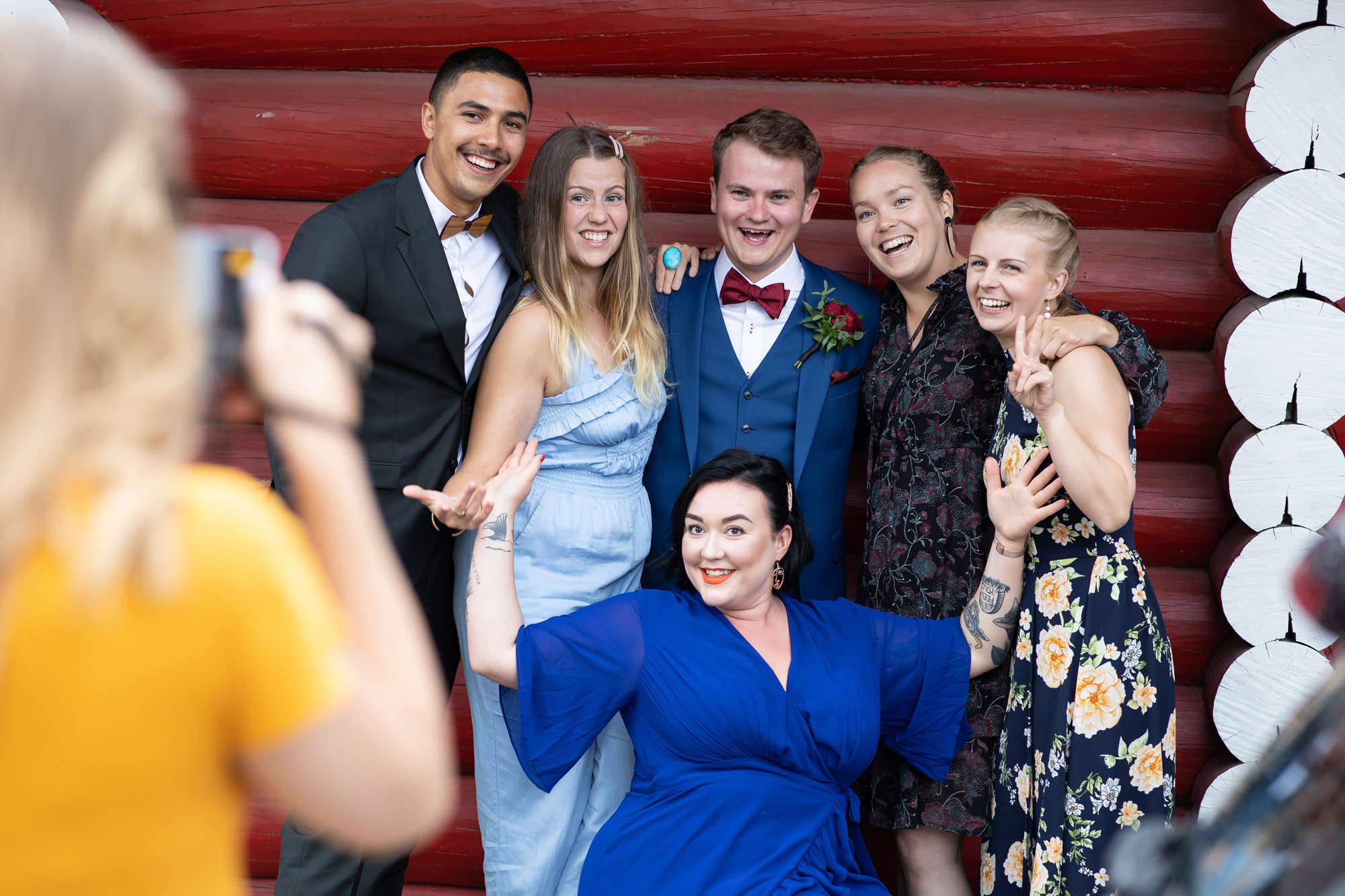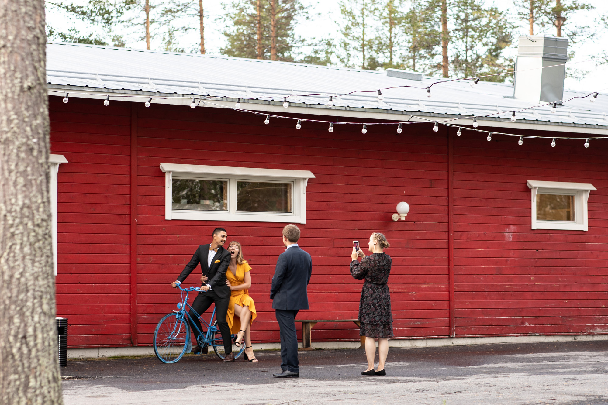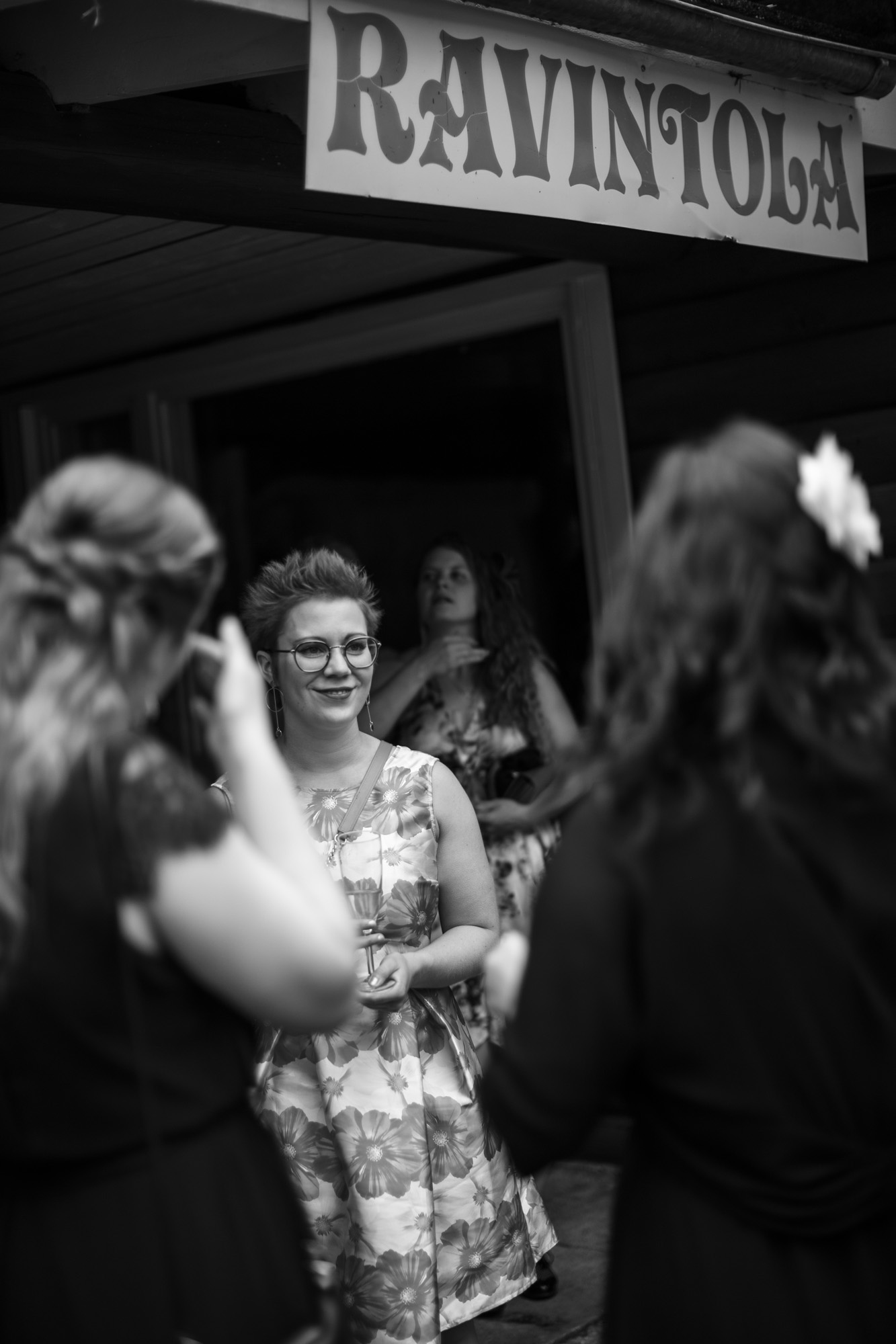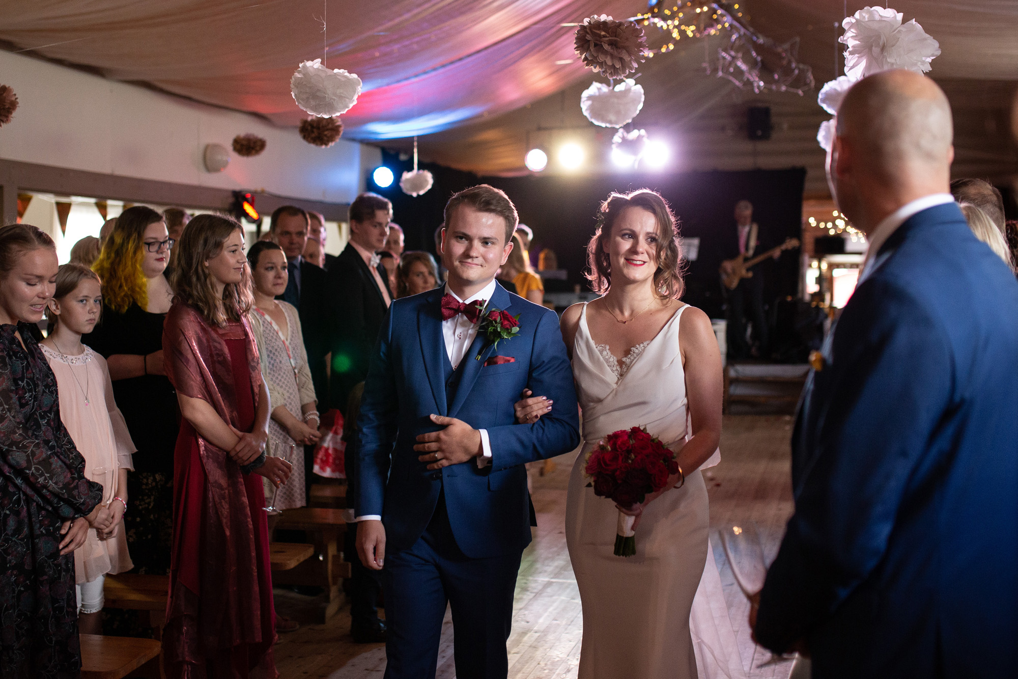Reetan ja Turkan kuvauksen aloitimme firstlookilla potrettikuvauspaikaksemme valikoituneella Ounasvaaralla. Tykkään kuvata potretit rauhassa ennen vihkimistä, jolloin vihkimisen jälkeen pari voi keskityä juhlimiseen. Firstlookin kuvaamisella ennen potrettikuvausta saa ihanasti taltoitua ne tunteet ja pienetkin eleet, kun pari näkee toisensa ensimmäisen kerran hääpäivänä. Toki pieniä kuvaussessioita voidaan järjestää myös kesken hääjuhlan, mutta suurin osa potreteista on mukava kuvata ilman kiirettä kun paikalla on vain hääpari ja mahdolliset assarit. Metsäinen maisema oli Reetalle ja Turkalle mieleinen ja lisäksi he toivoivat potretteja kuvattavan myös dronella. Tähän tarkoitukseen sopi mainiosti Ounasvaaran kalliot, jotka tarjoavat maanläheisen, rosoisen taustan nostaen parin upeasti esiin. Jonkin aikaa odotimme juuri sopivaa valoa, jotta aurinko kurkisti hieman pilvenreunan takaa. Lopputulos on nähtävillä gallerian viimeisenä ruutuna. Kuvasimme myös muita versioita, mutta tässä drammaattisen romanttisessa kuvassa kallioilla oli mielestämme sitä jotakin. Vihkiminen ja hääjuhla järjestettiin Palojärven lomakeskuksella, jossa kuvasin juhlan tunnelmia iltaan saakka.