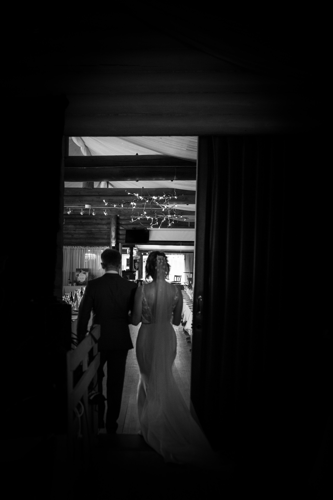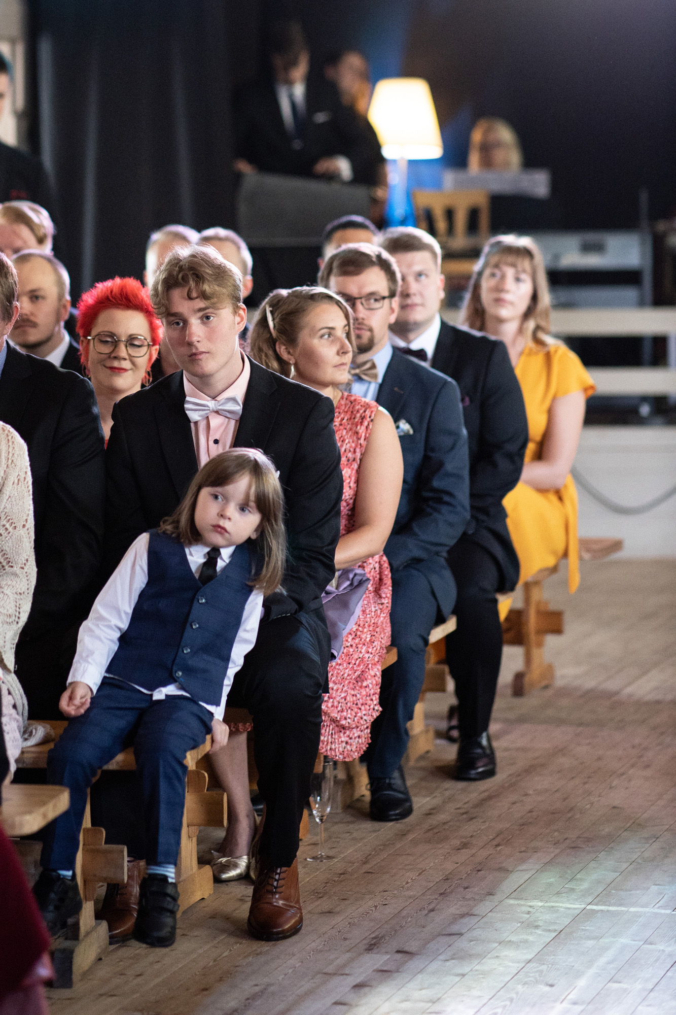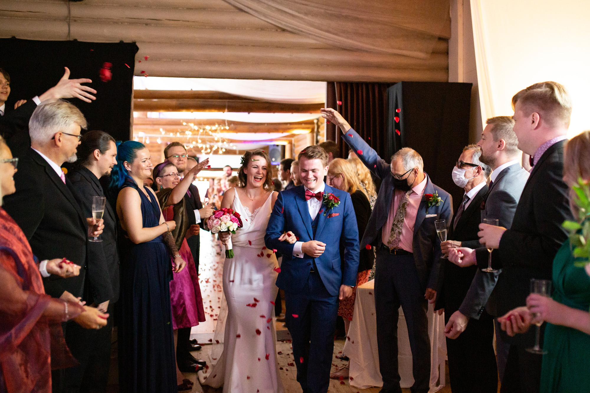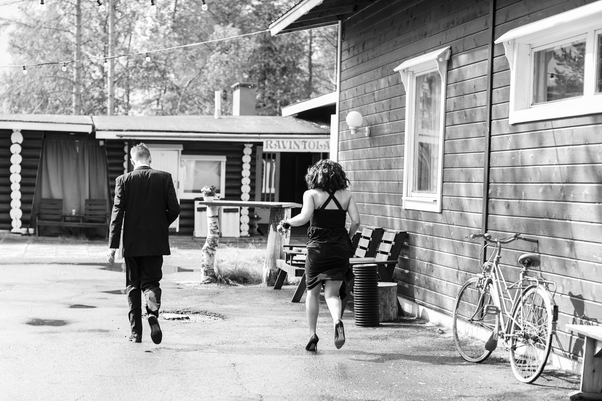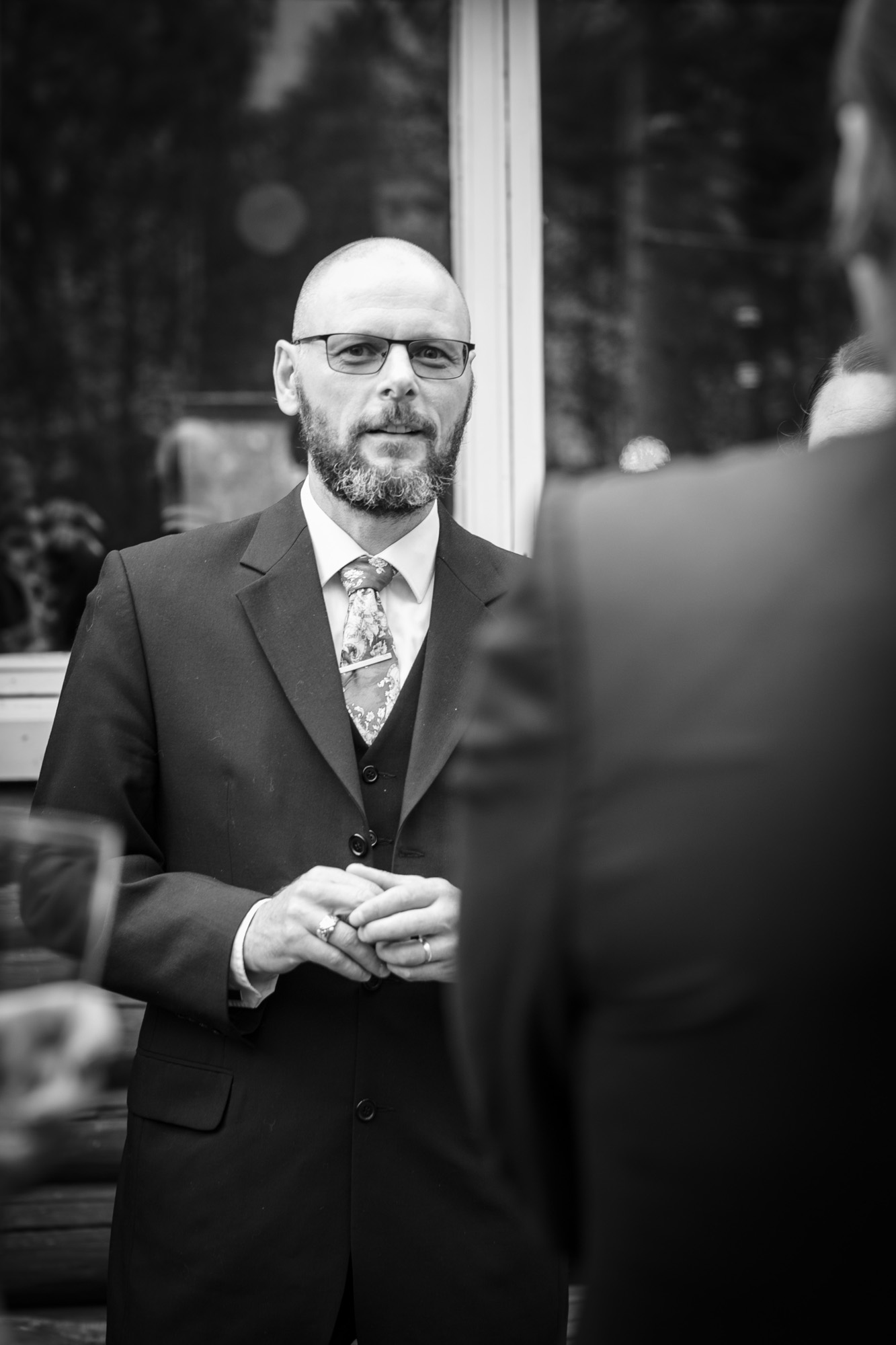 Reetan ja Turkan kuvauksen aloitimme firstlookilla potrettikuvauspaikaksemme valikoituneella Ounasvaaralla. Tykkään kuvata potretit rauhassa ennen vihkimistä, jolloin vihkimisen jälkeen pari voi keskityä juhlimiseen. Firstlookin kuvaamisella ennen potrettikuvausta saa ihanasti taltoitua ne tunteet ja pienetkin eleet, kun pari näkee toisensa ensimmäisen kerran hääpäivänä. Toki pieniä kuvaussessioita voidaan järjestää myös kesken hääjuhlan, mutta suurin osa potreteista on mukava kuvata ilman kiirettä kun paikalla on vain hääpari ja mahdolliset assarit. Metsäinen maisema oli Reetalle ja Turkalle mieleinen ja lisäksi he toivoivat potretteja kuvattavan myös dronella. Tähän tarkoitukseen sopi mainiosti Ounasvaaran kalliot, jotka tarjoavat maanläheisen, rosoisen taustan nostaen parin upeasti esiin. Jonkin aikaa odotimme juuri sopivaa valoa, jotta aurinko kurkisti hieman pilvenreunan takaa. Lopputulos on nähtävillä gallerian viimeisenä ruutuna. Kuvasimme myös muita versioita, mutta tässä drammaattisen romanttisessa kuvassa kallioilla oli mielestämme sitä jotakin. Vihkiminen ja hääjuhla järjestettiin Palojärven lomakeskuksella, jossa kuvasin juhlan tunnelmia iltaan saakka.