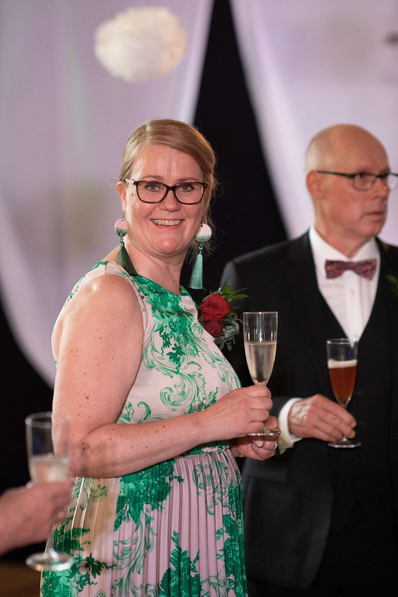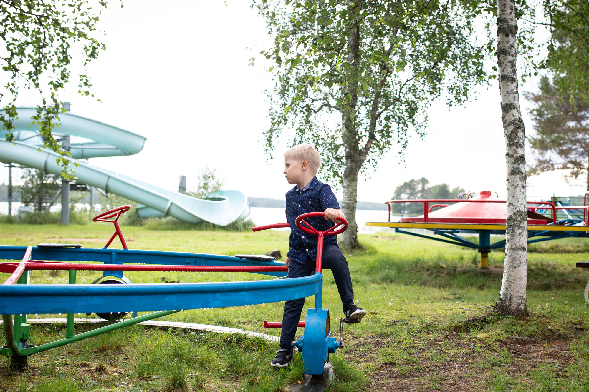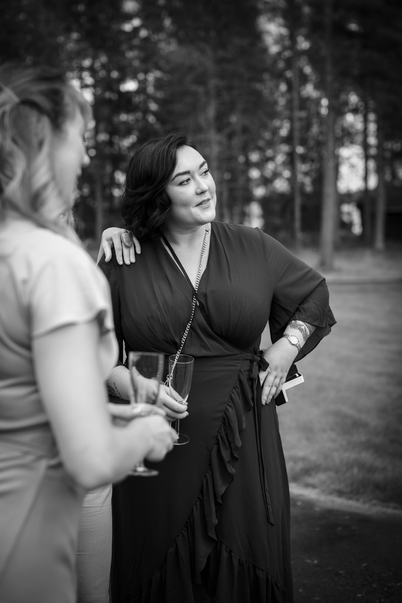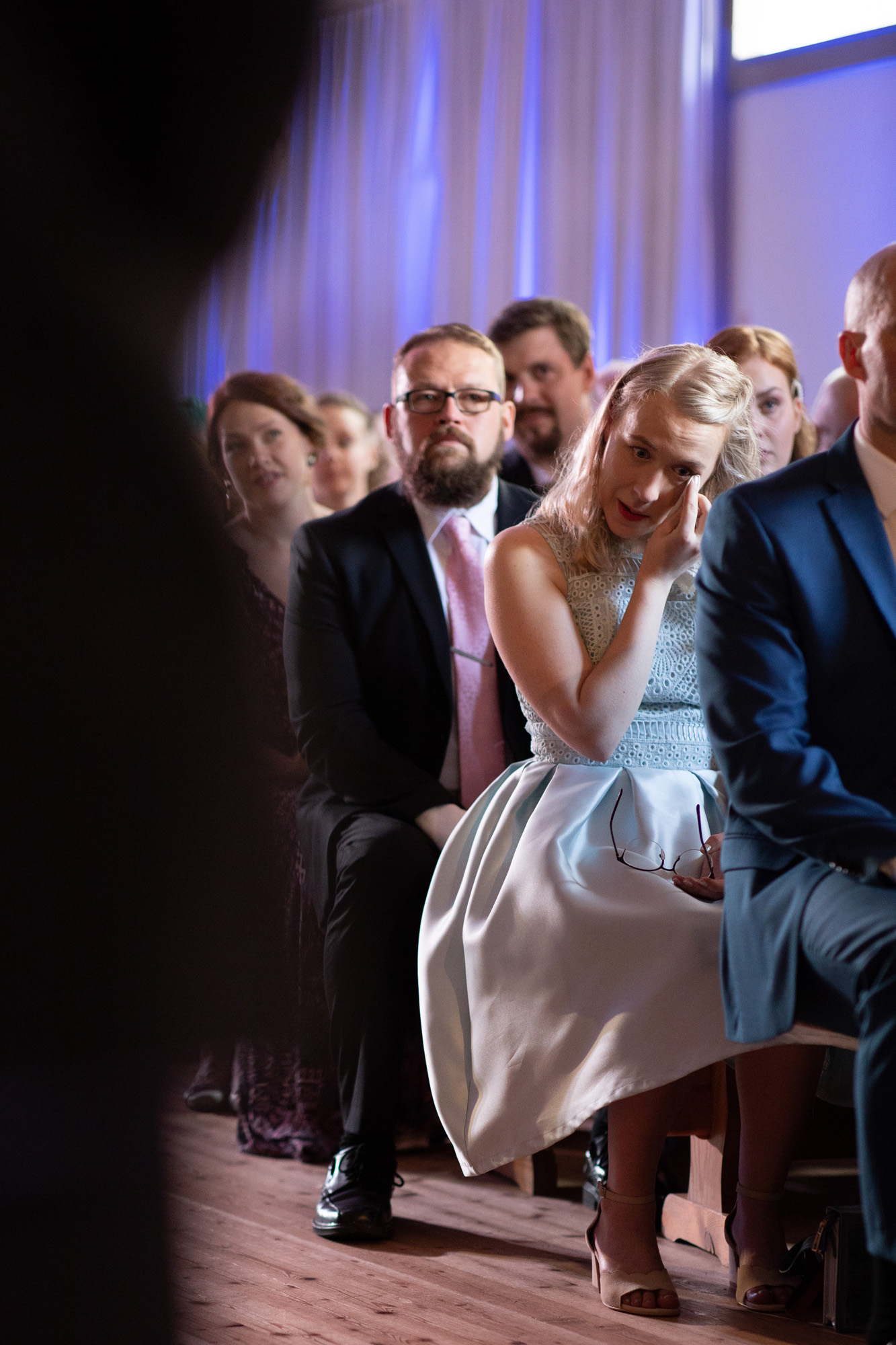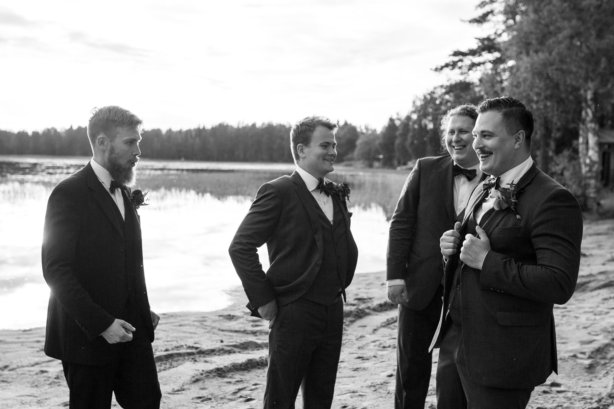 Reetan ja Turkan kuvauksen aloitimme firstlookilla potrettikuvauspaikaksemme valikoituneella Ounasvaaralla. Tykkään kuvata potretit rauhassa ennen vihkimistä, jolloin vihkimisen jälkeen pari voi keskityä juhlimiseen. Firstlookin kuvaamisella ennen potrettikuvausta saa ihanasti taltoitua ne tunteet ja pienetkin eleet, kun pari näkee toisensa ensimmäisen kerran hääpäivänä. Toki pieniä kuvaussessioita voidaan järjestää myös kesken hääjuhlan, mutta suurin osa potreteista on mukava kuvata ilman kiirettä kun paikalla on vain hääpari ja mahdolliset assarit. Metsäinen maisema oli Reetalle ja Turkalle mieleinen ja lisäksi he toivoivat potretteja kuvattavan myös dronella. Tähän tarkoitukseen sopi mainiosti Ounasvaaran kalliot, jotka tarjoavat maanläheisen, rosoisen taustan nostaen parin upeasti esiin. Jonkin aikaa odotimme juuri sopivaa valoa, jotta aurinko kurkisti hieman pilvenreunan takaa. Lopputulos on nähtävillä gallerian viimeisenä ruutuna. Kuvasimme myös muita versioita, mutta tässä drammaattisen romanttisessa kuvassa kallioilla oli mielestämme sitä jotakin. Vihkiminen ja hääjuhla järjestettiin Palojärven lomakeskuksella, jossa kuvasin juhlan tunnelmia iltaan saakka.